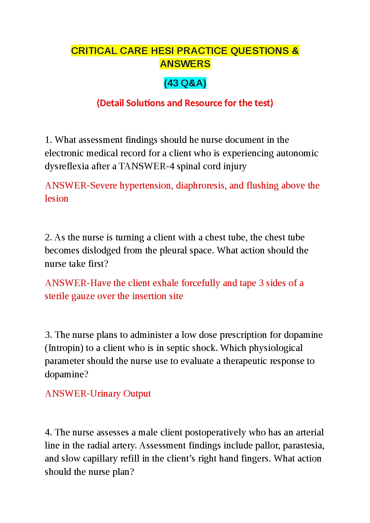 CRITICAL CARE HESI PRACTICE QUESTIONS & ANSWERS (43 Q&A) (Detail Solutions and Resource for the test)