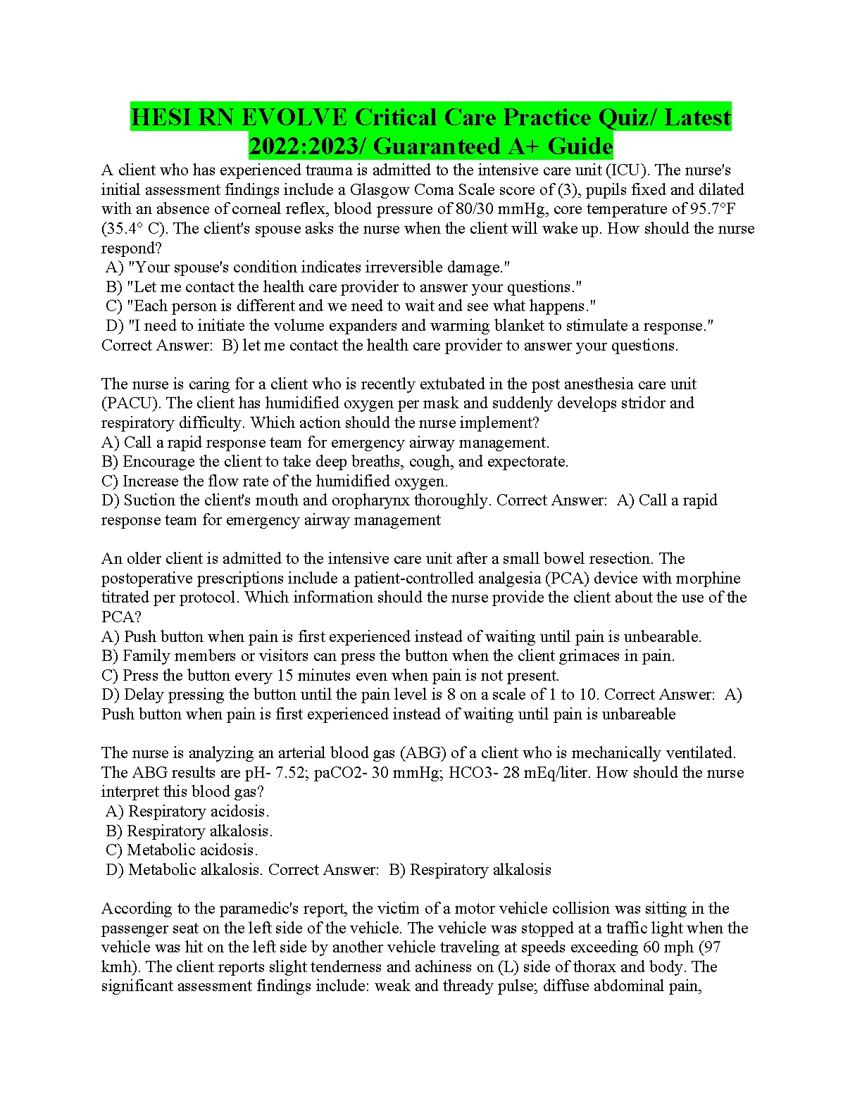HESI RN EVOLVE Critical Care Practice Quiz/ Latest 2022:2023/ Guaranteed A+ Guide. DOWNLOAD on www.hackedexams.com INSTANTLY.