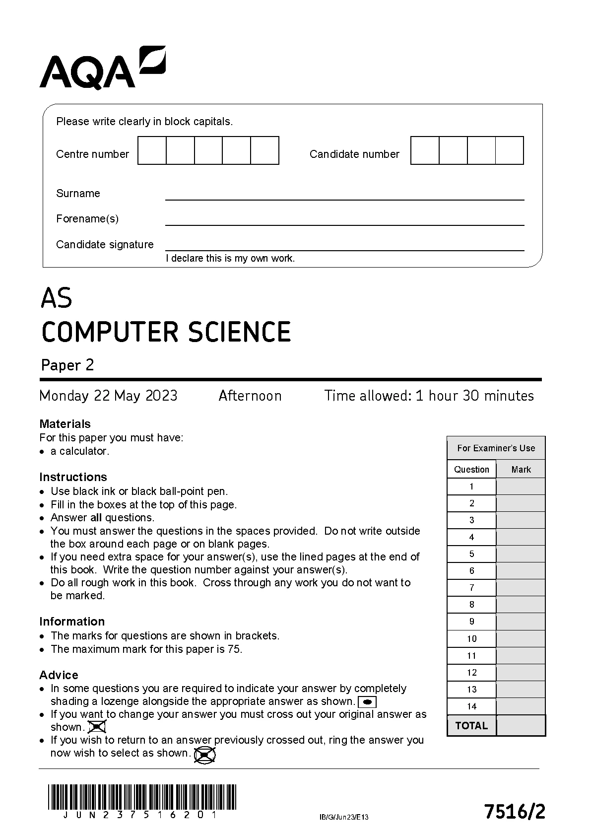 AQA AS COMPUTER SCIENCE PAPER 2 MAY 2023 QUESTION PAPER (7516/2). DOWNLOAD OFFICIAL AND VERIFIED AQA AS COMPUTER SCIENCE PAPER 2 MAY 2023 on www.hackedexams.com INSTANTLY.