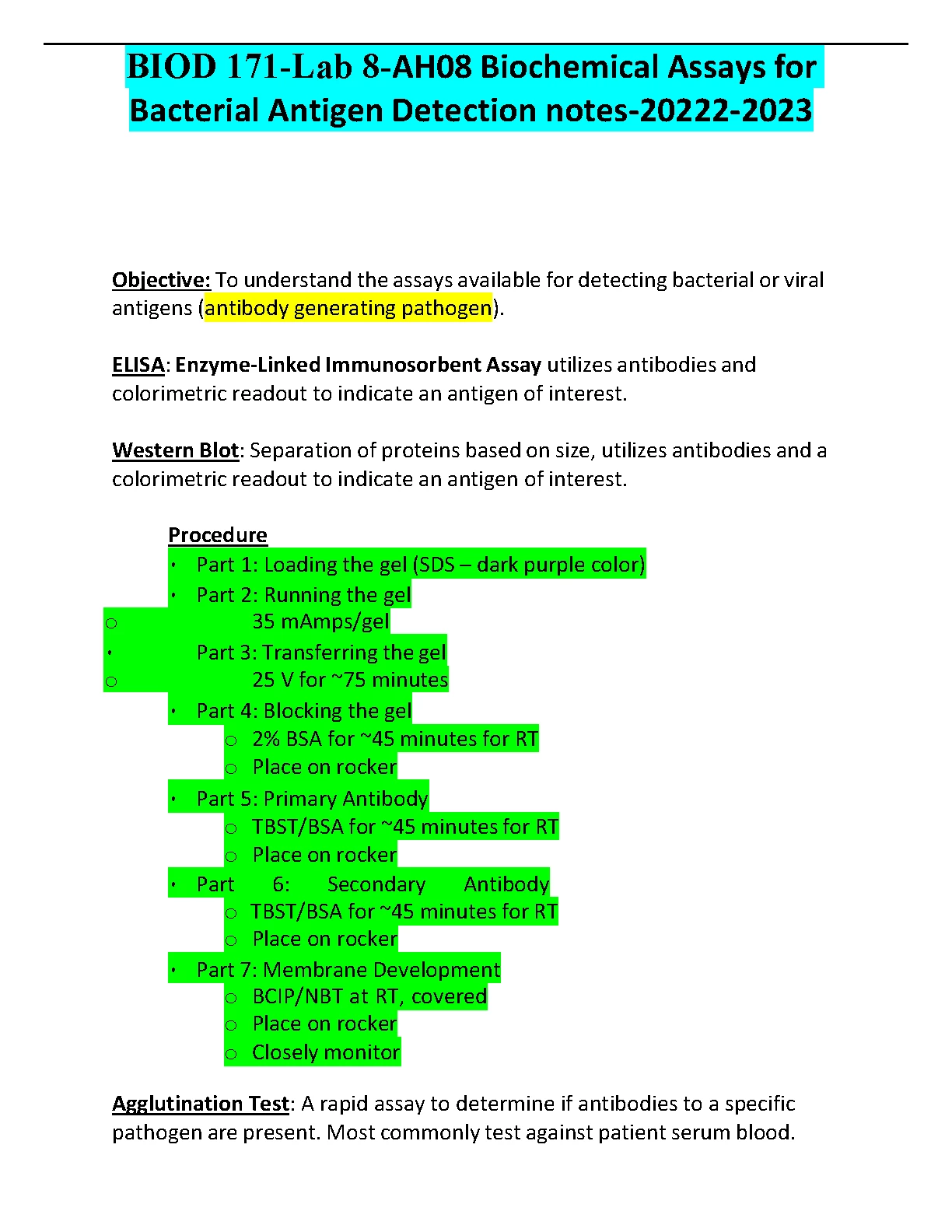 BIOD 171-Lab 8-AH08 Biochemical Assays for Bacterial Antigen Detection notes 2022/2023. DOWNLOAD on www.hackedexams.com INSTANTLY.