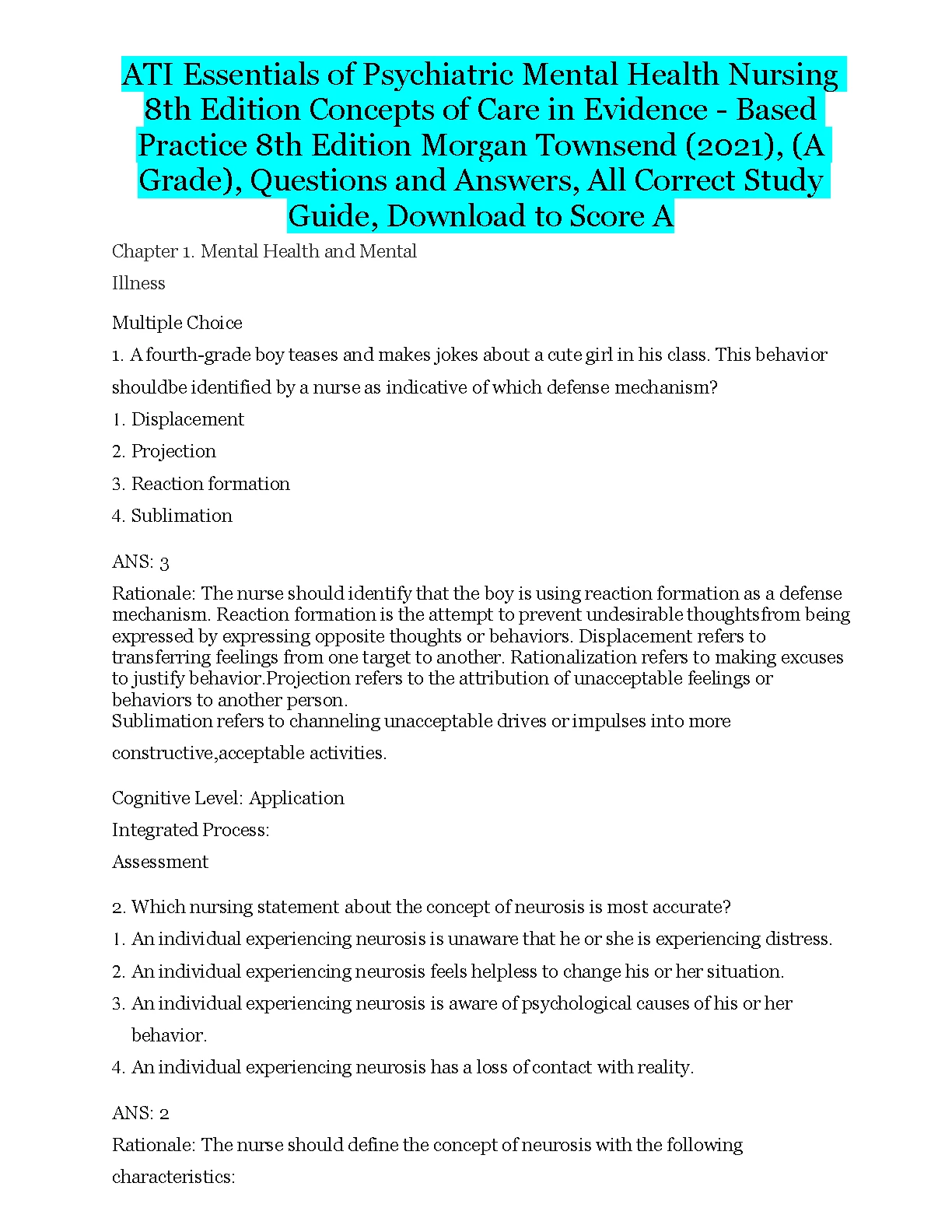 ATI Essentials of Psychiatric Mental Health Nursing 8th Edition Concepts of Care in Evidence - Based Practice 8th Edition Morgan Townsend (2021), (A Grade), Questions and Answers, All Correct Study Guide,. DOWNLOAD on www.hackedexams.com INSTANTLY.
