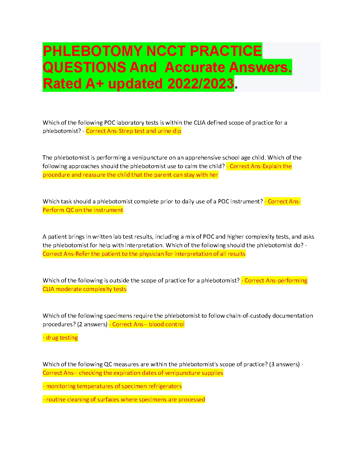 PHLEBOTOMY NCCT PRACTICE QUESTIONS And Accurate Answers. Rated A+ updated 2022/2023. DOWNLOAD on www.hackedexams.com INSTANTLY.