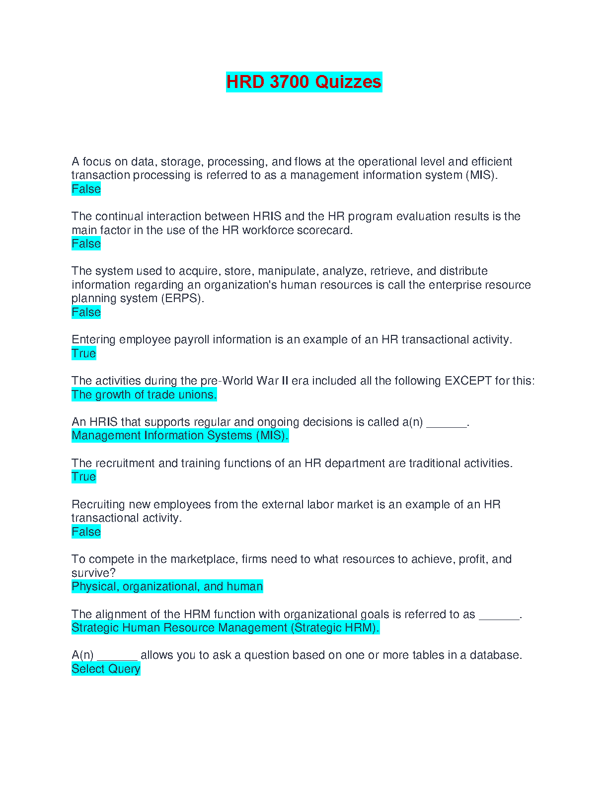 Boost your understanding of Human Resource Management with this comprehensive set of HRD 3700 quizzes. Covering key concepts like Management Information Systems (MIS), Strategic Human Resource Management (Strategic HRM), and enterprise resource planning (ERPS), these quizzes are designed to help students excel in their 2025/2026 academic year and avoid resits. Perfect for self-study and exam preparation.