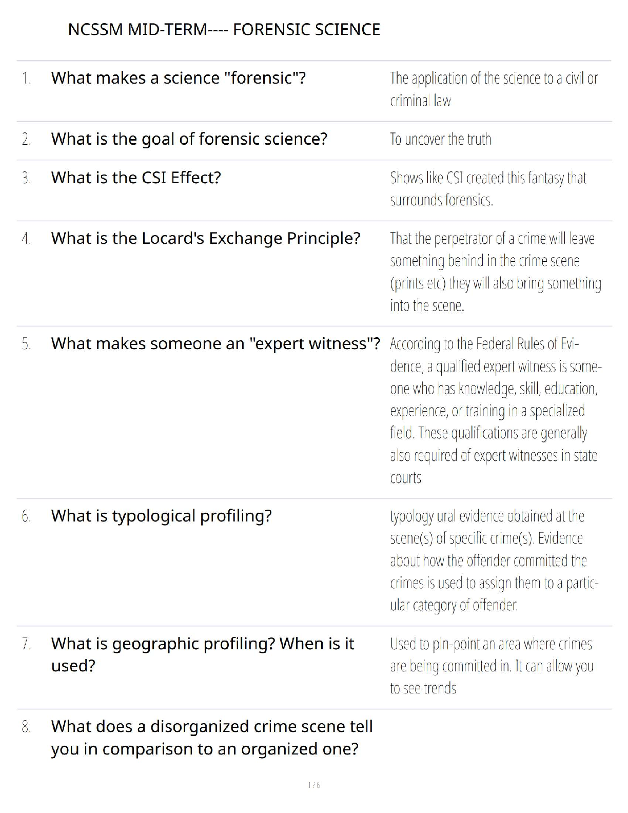Prepare for your 2025/2026 academic year exams with this comprehensive set of Forensic Science mid-term questions and answers from NCSSM. This resource covers key topics including the definition of forensic science, the CSI effect, Locard's Exchange Principle, expert witness qualifications, typological profiling, geographic profiling, and crime scene analysis. Ace your exams on the first attempt and avoid resits with targeted study materials.