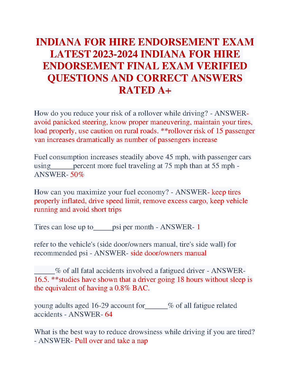 Master the Indiana For-Hire Endorsement Exam with this comprehensive guide featuring the latest 2023-2024 questions and verified, correct answers. Designed to help you pass on your first attempt and avoid resits, this resource covers key topics such as rollover risk, fuel economy, tire maintenance, fatigue, and safe driving practices. Ace your exam and get endorsements for your career!