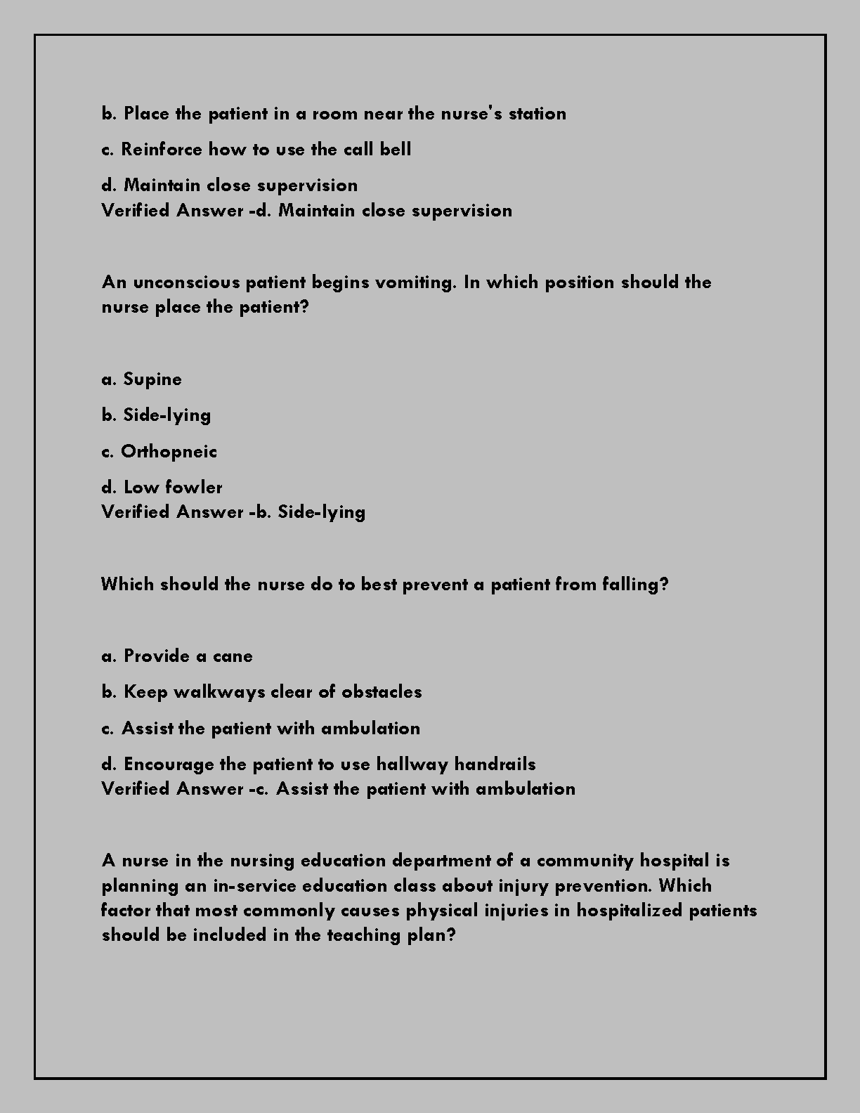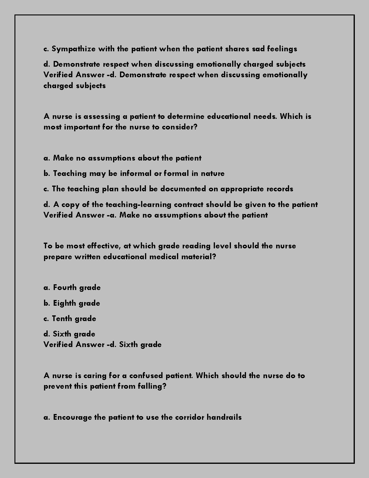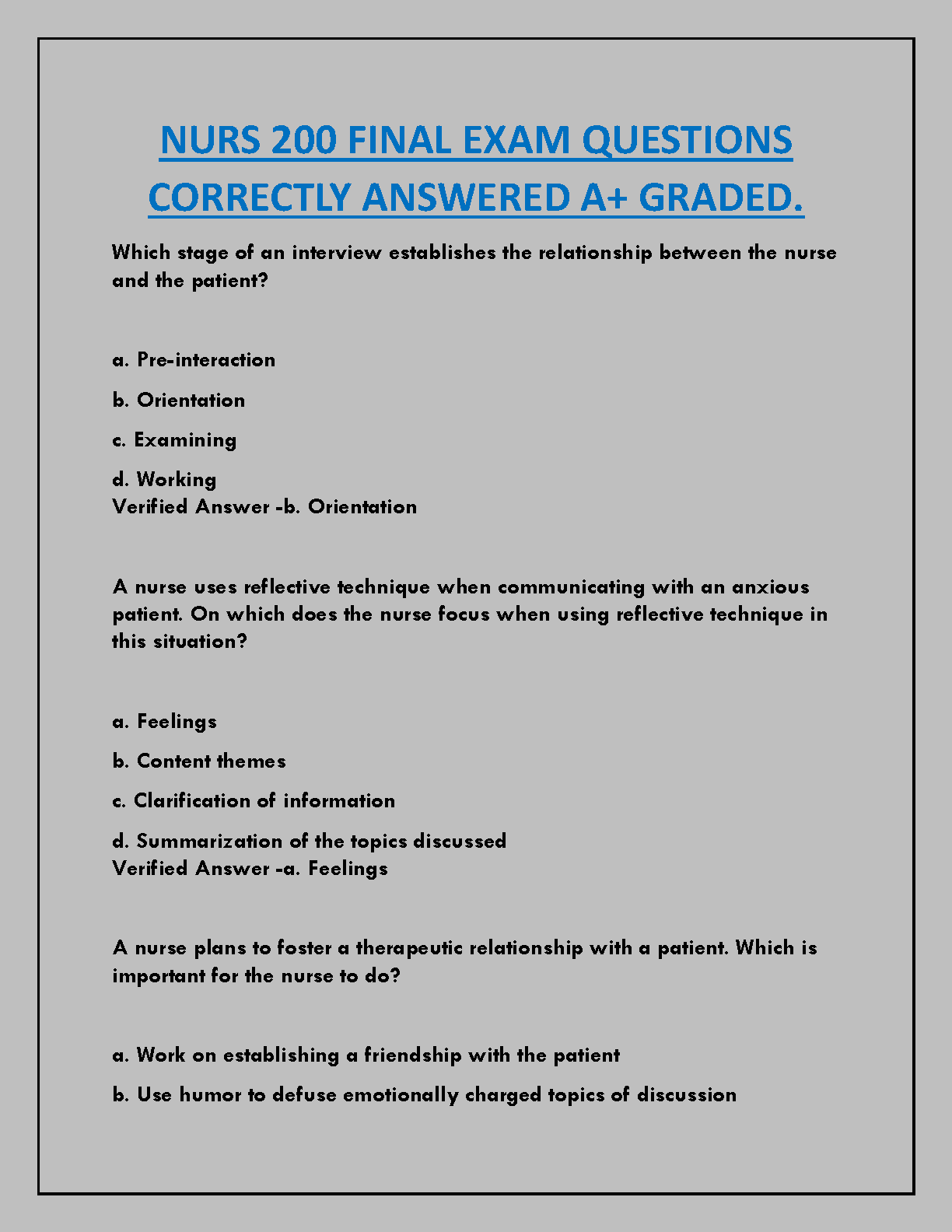 Master your NURS 200 Final Exam with this comprehensive test bank featuring A+ graded questions and verified answers. Designed to align with core concepts from Potter and Perry's Fundamentals of Nursing, 11th Edition (by Patricia A. Potter, Anne Griffin Perry, Patricia Stockert, Amy Hall), this resource provides essential practice for the 2025/2026 academic year. Prepare confidently to pass your nursing exams on the first attempt, boosting your understanding of critical nursing principles and therapeutic communication to avoid resits.