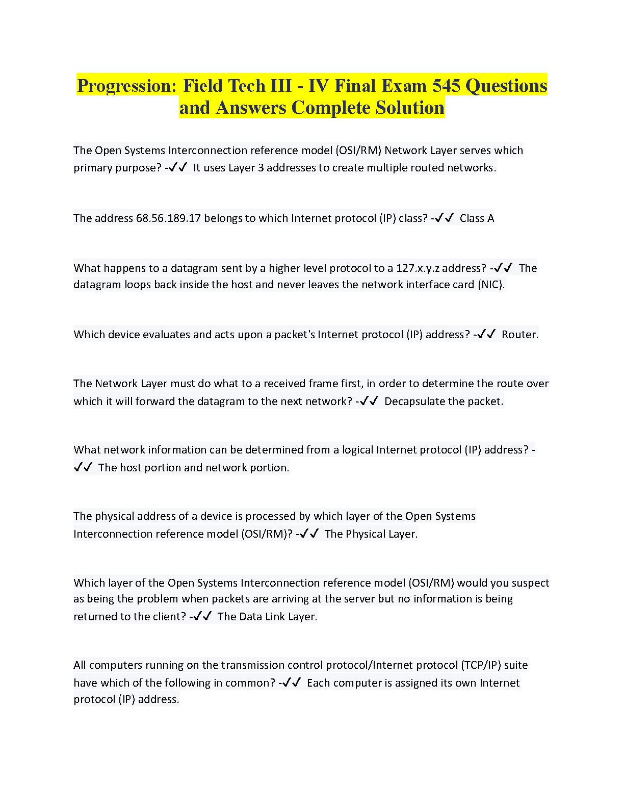 Ace your Field Tech III - IV Final Exam with this comprehensive resource! This complete solution set provides 545 questions and answers designed to help students master the material and pass their exams on the first attempt, avoiding resits. Covers key networking concepts like the OSI model, IP addressing, and data transmission.