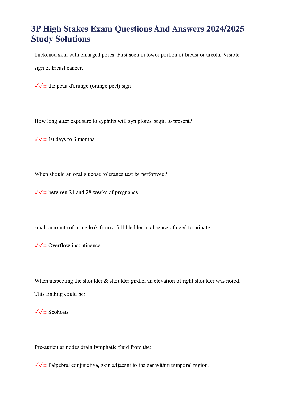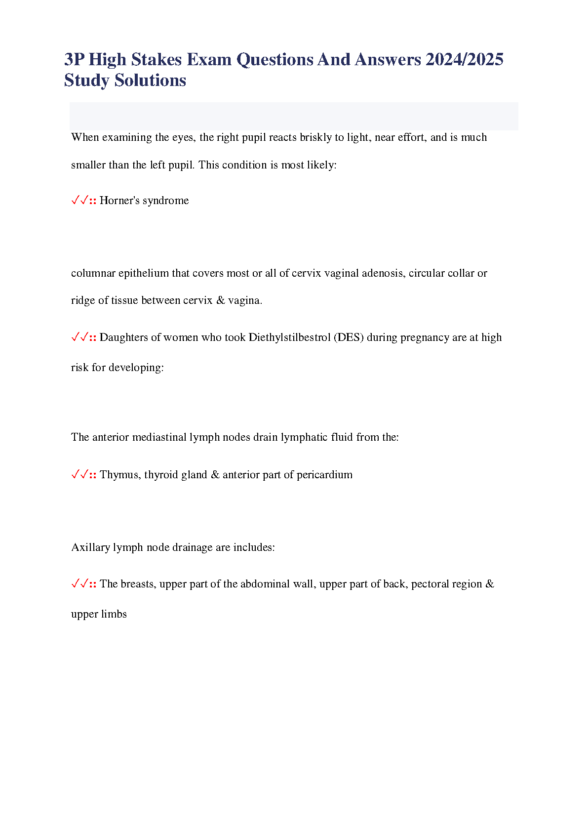 Unlock your full potential for the 3P High Stakes Exam with this comprehensive 2024/2025 study solution. This resource features an extensive collection of exam-style questions coupled with detailed, clear answers and insightful study explanations. Designed to empower students, it ensures thorough preparation, helping you to understand critical concepts, reinforce knowledge, and build the confidence needed to pass your exams on the very first attempt. Maximize your scores and strategically avoid the need for costly resits with this essential exam preparation tool tailored for the upcoming academic year.