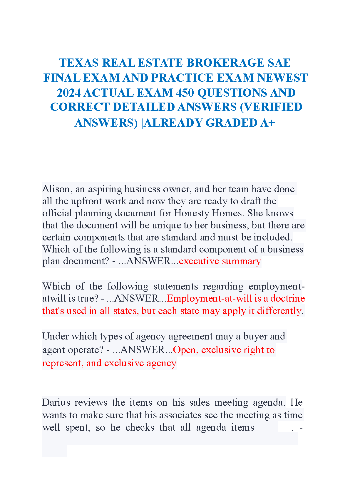 Texas Real Estate Brokerage SAE Final Exam Prep 2024: 450 Verified Questions & Detailed Answers (Newest A+ Graded Edition) - Ace Your Exam First Try!