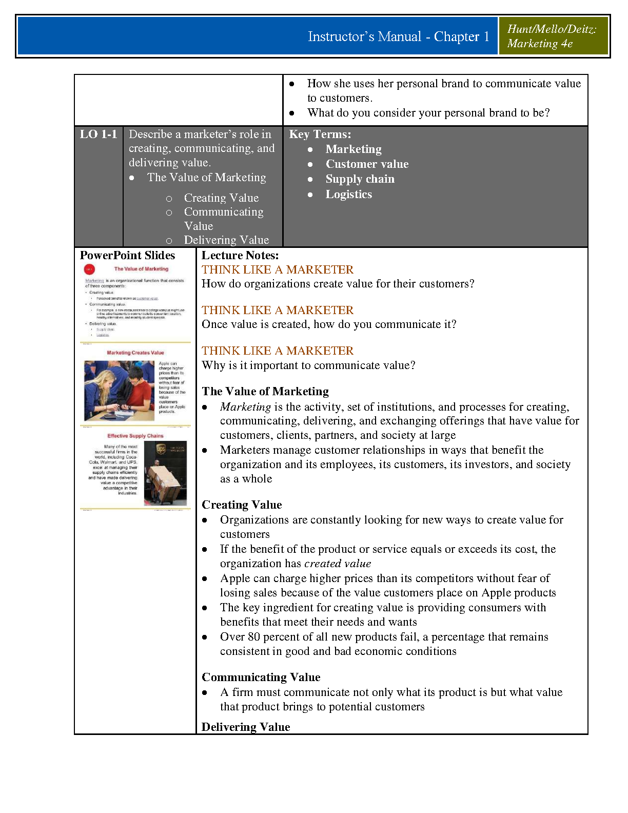 Instructor's Manual for Marketing, 4th Edition by Shelby D. Hunt, Jeffrey A. Mello, & Greg Deitz - Chapter 1 Exam Prep Resource