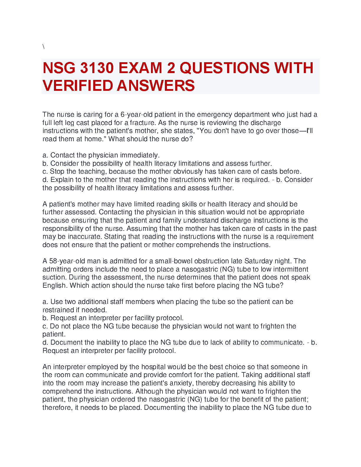Master the NSG 3130 curriculum with this comprehensive set of verified exam questions and answers. Designed to help nursing students excel in their studies and pass exams on the first attempt, this resource covers critical topics and provides detailed explanations. Perfect for the upcoming 2025/2026 academic year, ensure you are well-prepared and avoid the stress of resits.