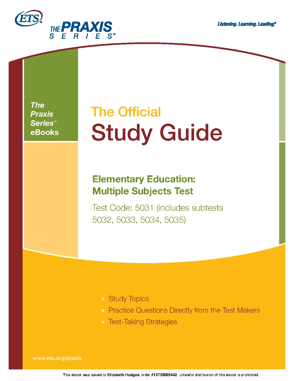 The Official Study Guide Elementary Education: Multiple Subjects Test Test Code: 5031 (includes subtests 5032, 5033, 5034, 5035)Study Topics ■ Practice Questions Directly from the Test Makers ■ Test-Taking Strategies BY Elizabeth Hodges