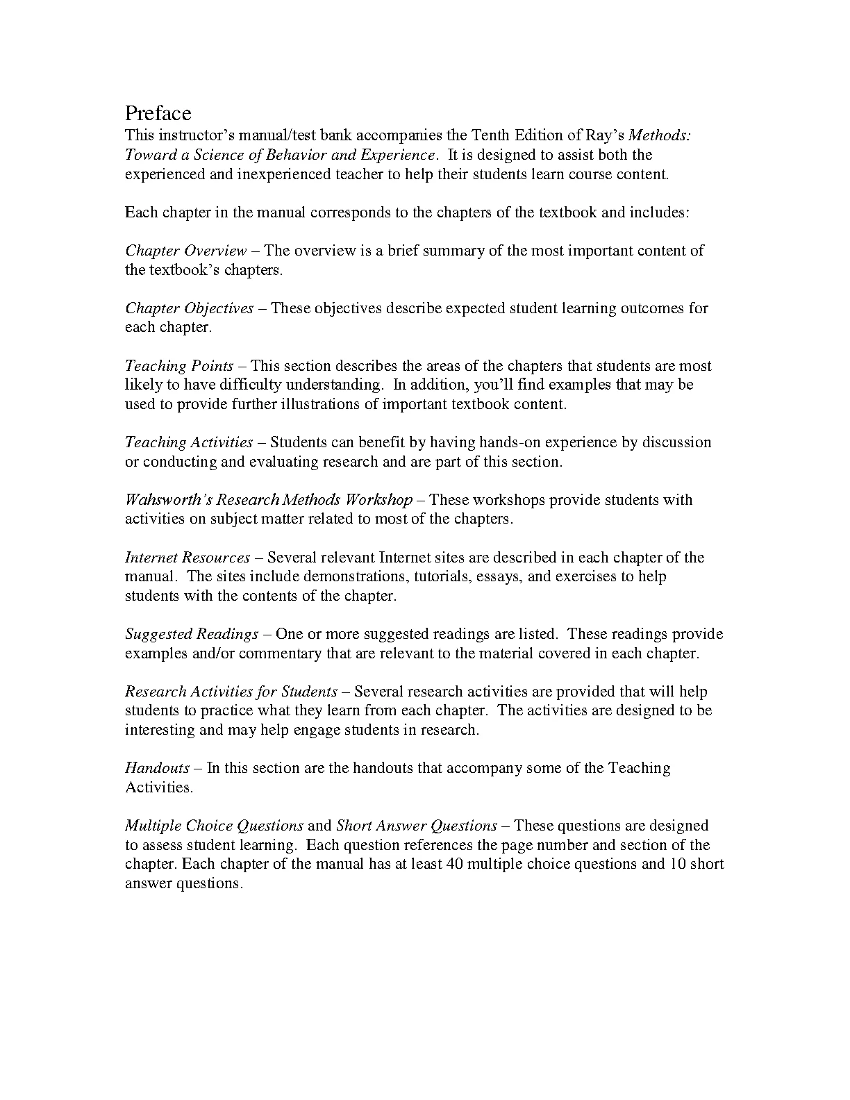 Instructor’s Manual with Test Bank Methods Toward a Science of Behavior and Experience TENTH EDITION William J. Ray
