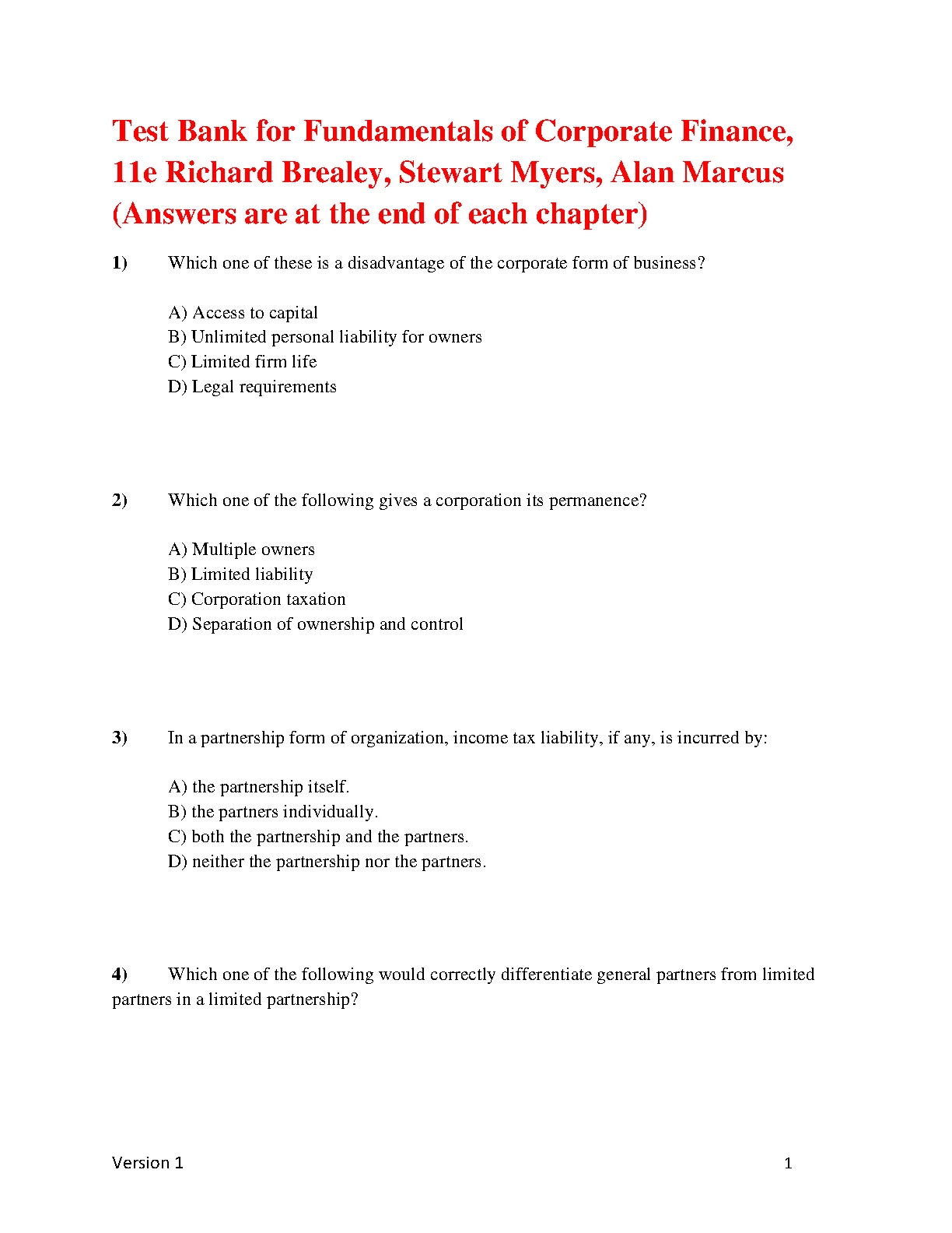Test Bank for Fundamentals of Corporate Finance, 11TH EDITION Richard Brealey, Stewart Myers, Alan Marcus (Answers are at the end of each chapter). DOWNLOAD on www.hackedexams.com INSTANTLY.