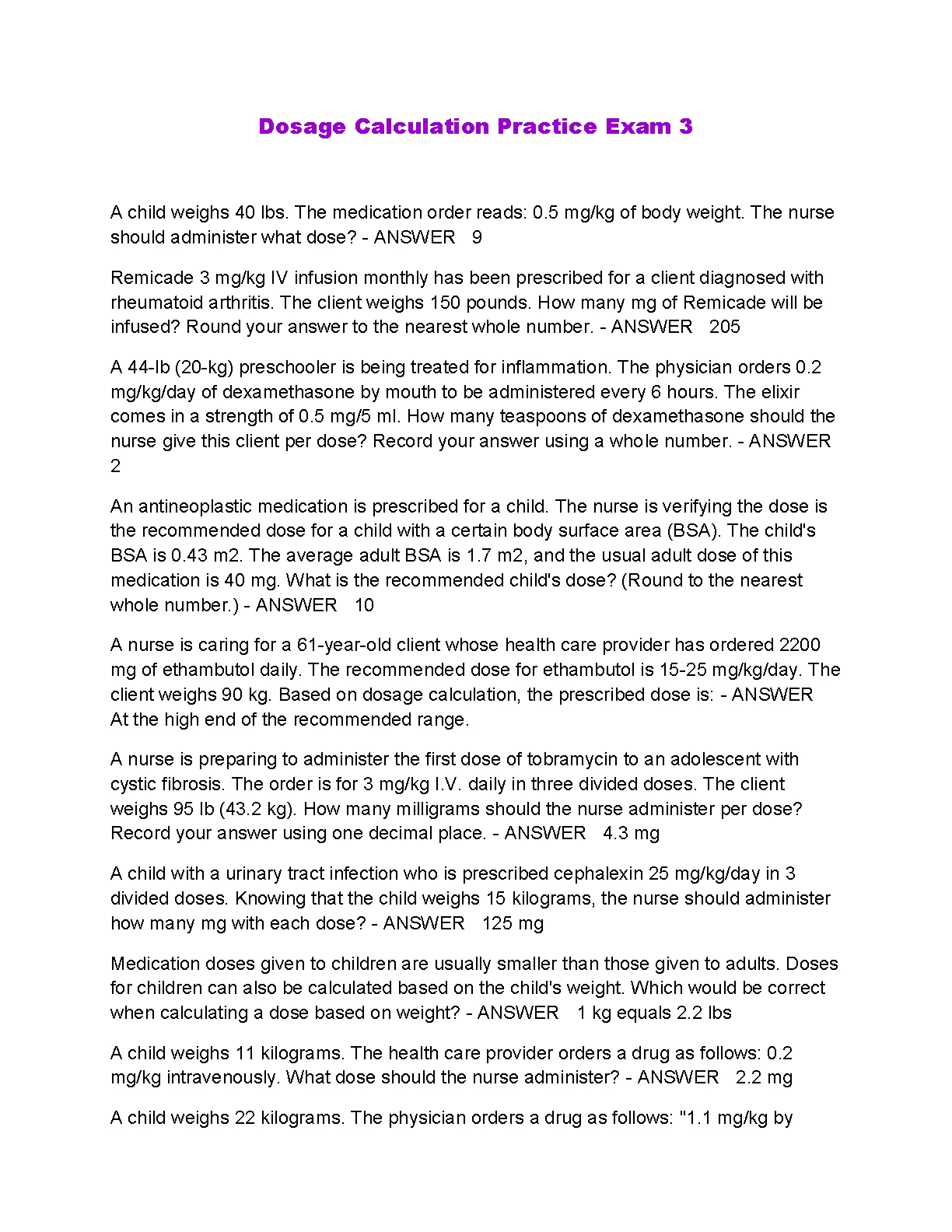 Dosage Calculation Practice Exam 3 COMPLETE SOLUTION 100% CORRECT. DOWNLOAD INSTANTLY on www.hackedexams.com
