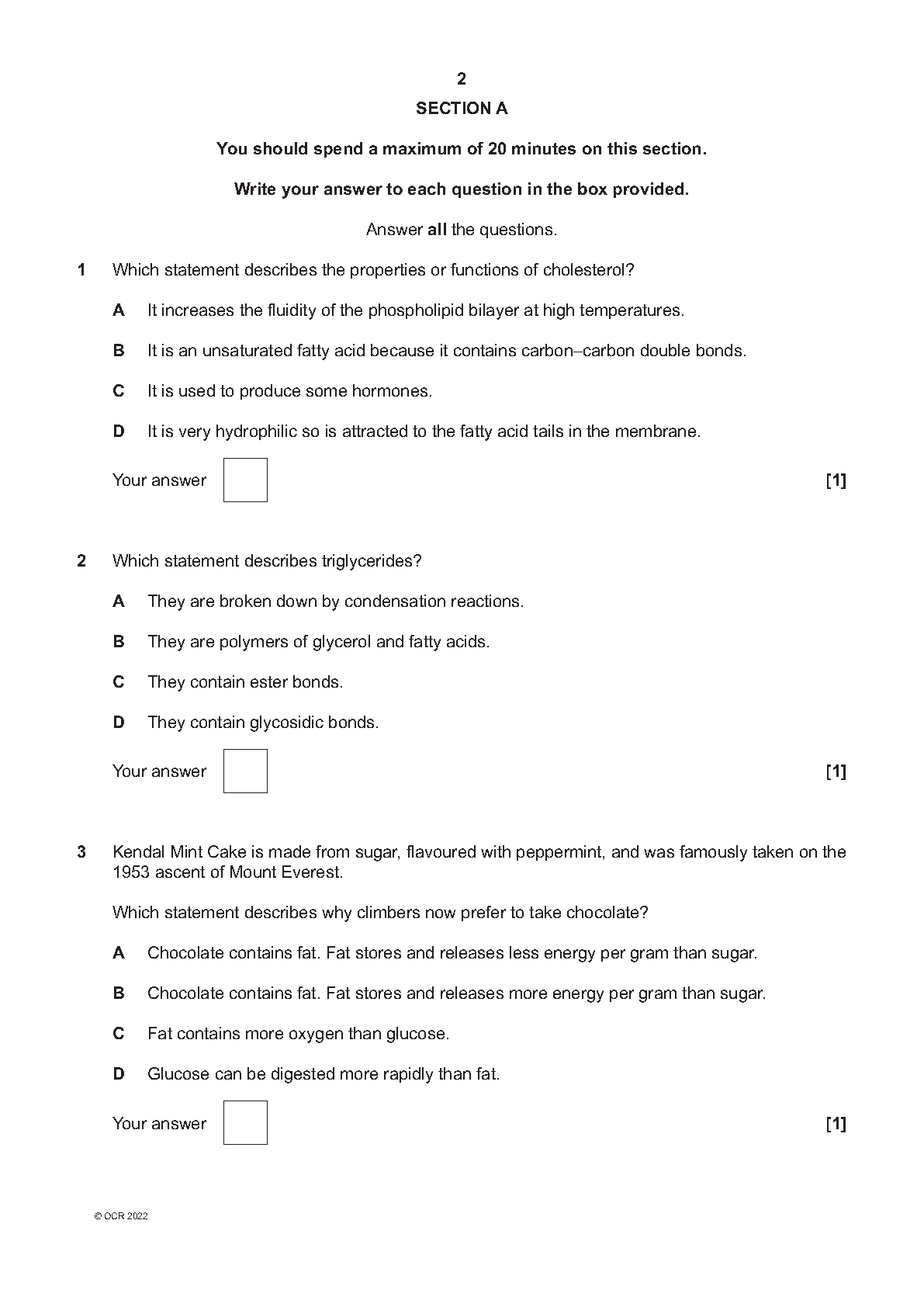 OCR A LEVEL BIOLOGY A PAPER 1 JUNE 2022 QUESTION PAPER (H420/01: Biological processes)