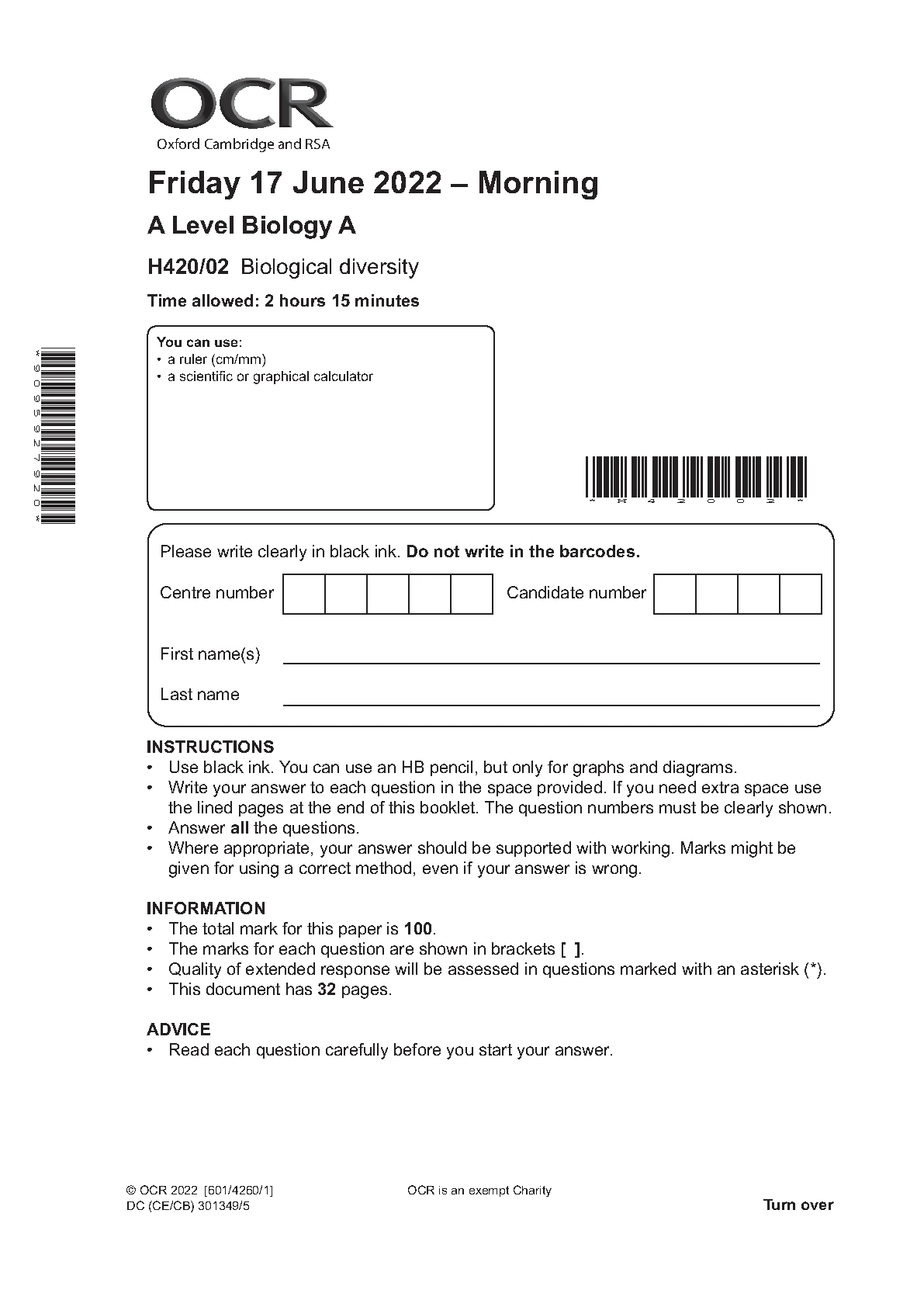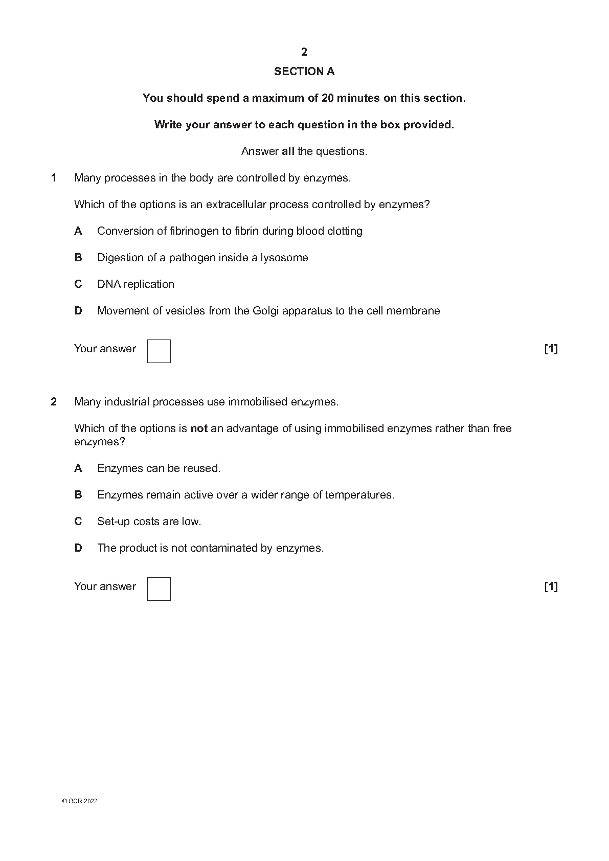 OCR A LEVEL BIOLOGY A PAPER 2 JUNE 2022 QUESTION PAPER (H420/02: Biological diversity)