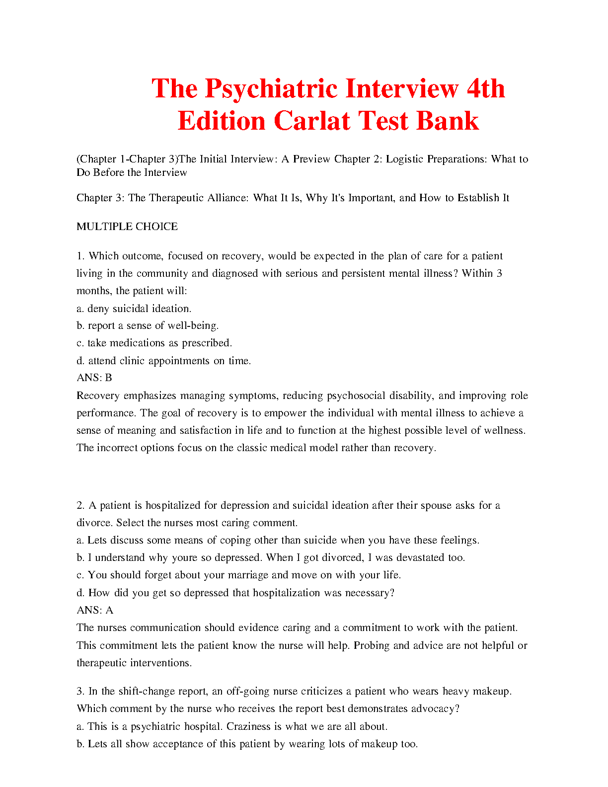 The Psychiatric Interview 4th Edition BY Carlat Test Bank