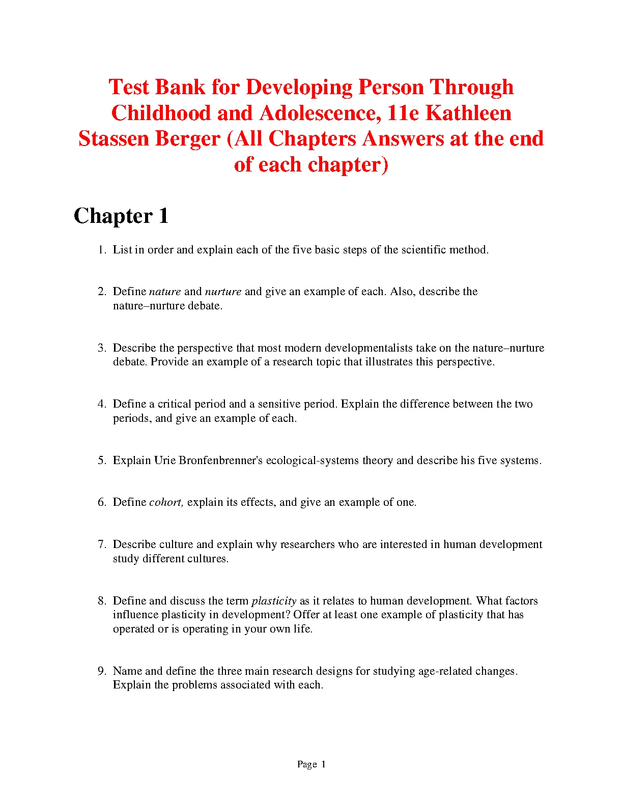 Test Bank for Developing Person Through Childhood and Adolescence, 11TH EDITION BY Kathleen Stassen Berger (All Chapters Answers at the end of each chapter)