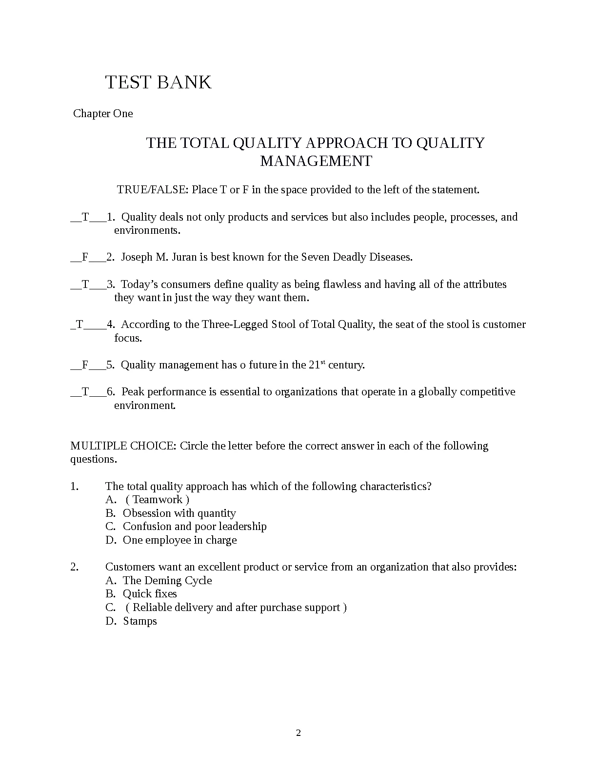 Test Bank & Instructor’s Solutions Manual to accompany QUALITY MANAGEMENT for Organizational Excellence Seventh Edition David L. Goetsch Stanley B. Davis