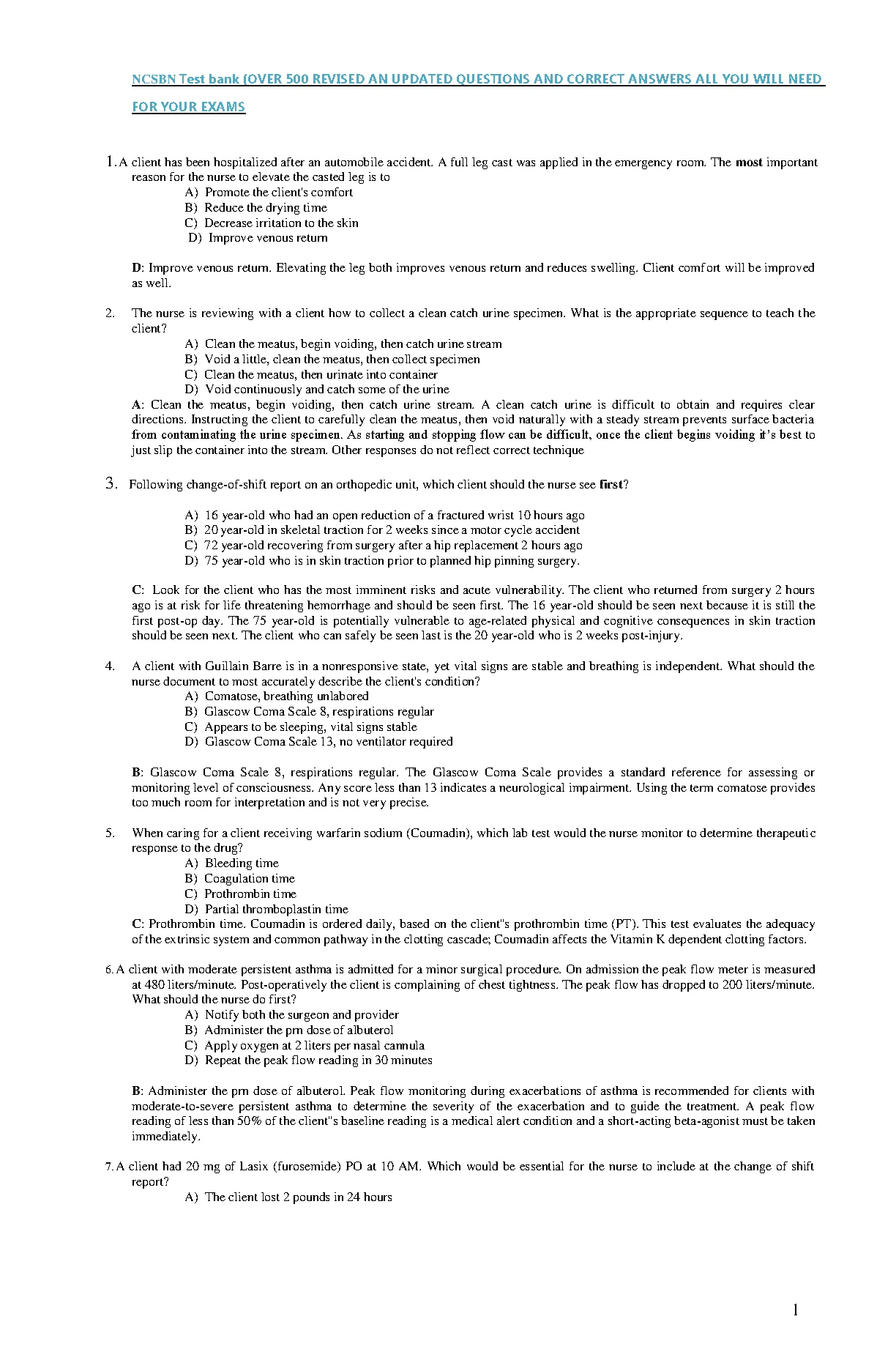 NCSBN Test Bank (OVER 500 REVISED AN UPDATED QUESTIONS AND CORRECT ANSWERS ALL YOU WILL NEED FOR YOUR EXAMS