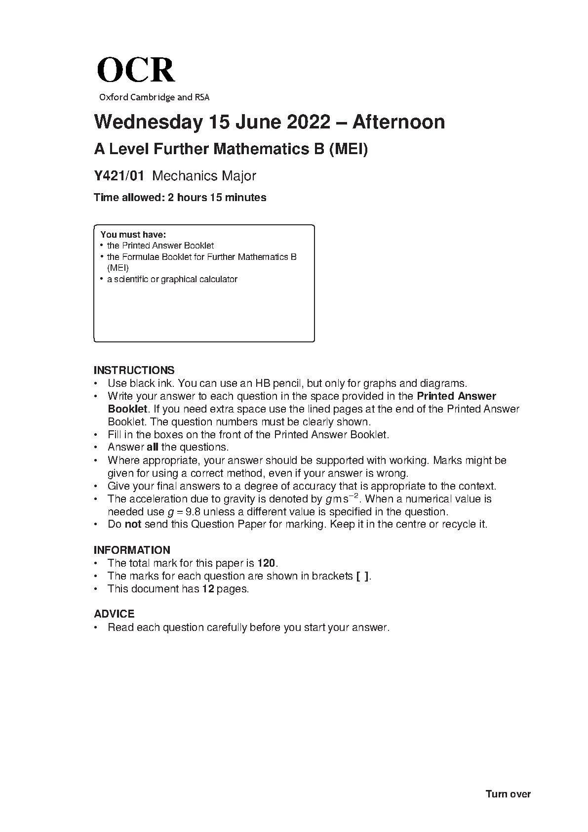 OCR A LEVEL FURTHER MATHEMATICS B PAPER 1 JUNE 2022 QUESTION PAPER (Y421/01: Mechanics Major)