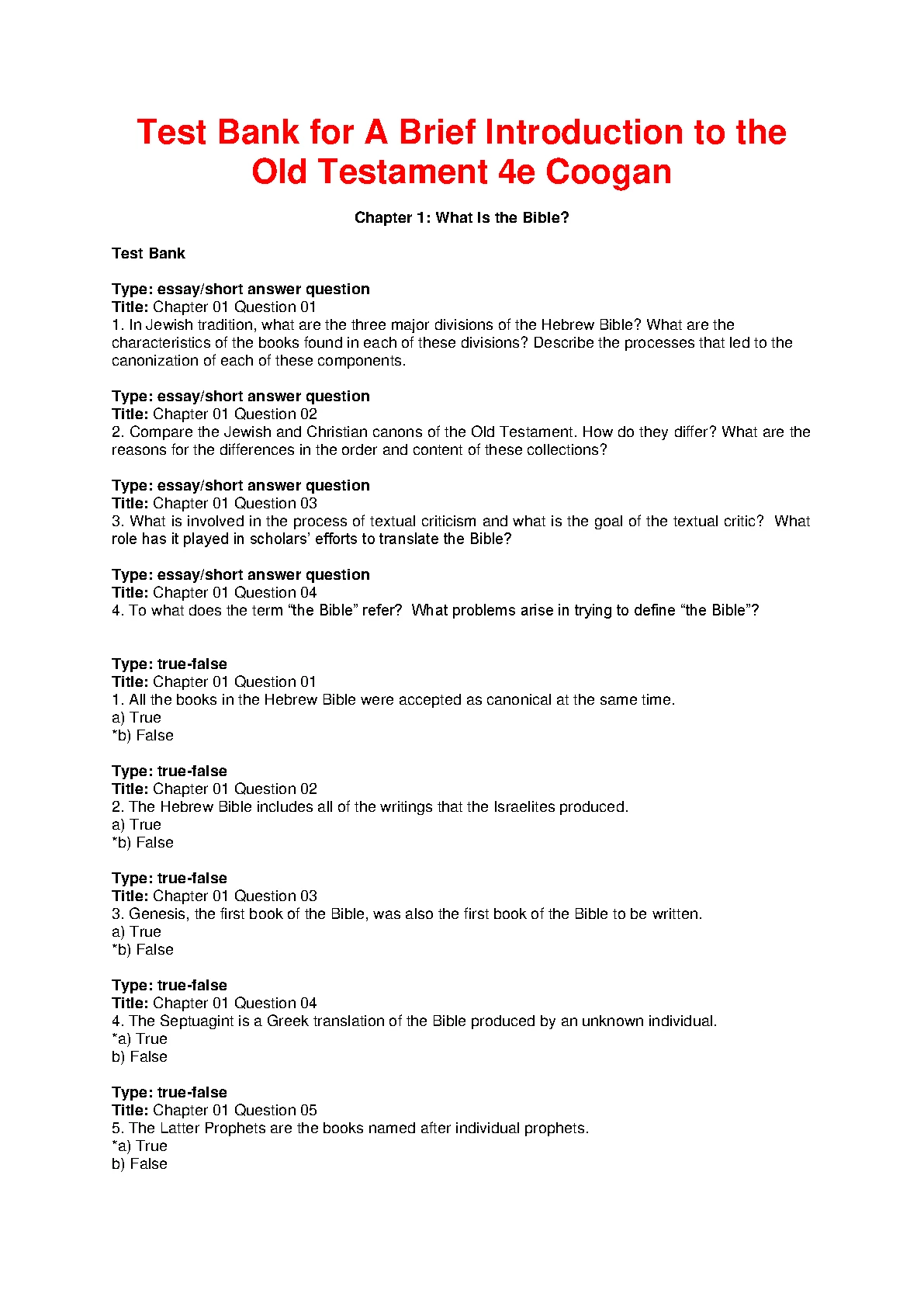 Test Bank for A Brief Introduction to the Old Testament 4TH EDITION BY Coogan