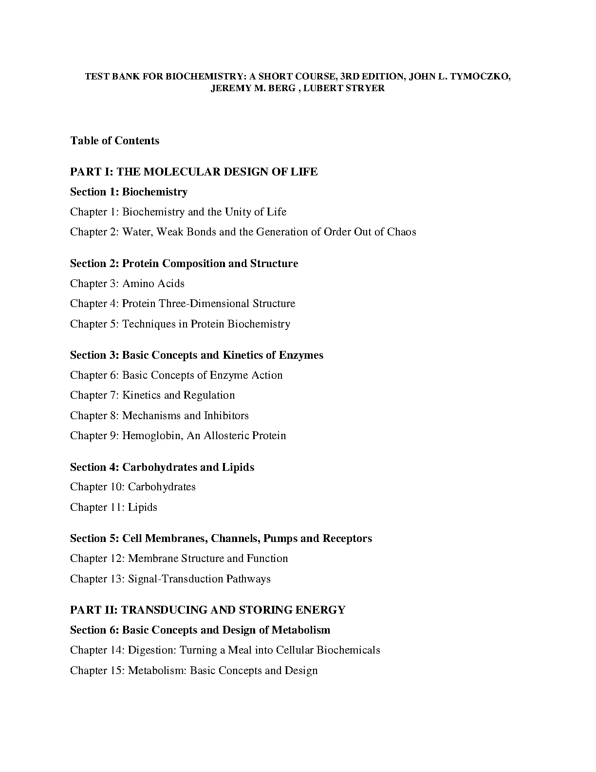 TEST BANK FOR BIOCHEMISTRY: A SHORT COURSE, 3RD EDITION, JOHN L. TYMOCZKO, JEREMY M. BERG , LUBERT STRYER