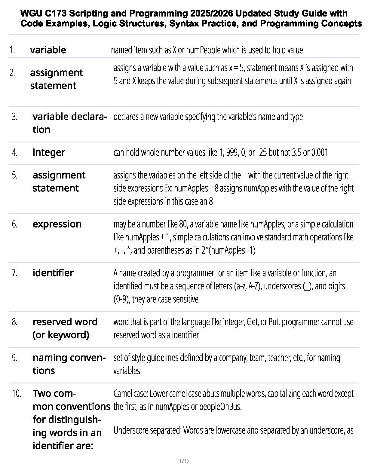 Conquer WGU C173 Scripting and Programming with this comprehensive 2025/2026 study guide. Master code examples, logic structures, syntax, and programming concepts to pass your exams on the first try and avoid resits. This updated guide provides the essential knowledge to excel in your course.