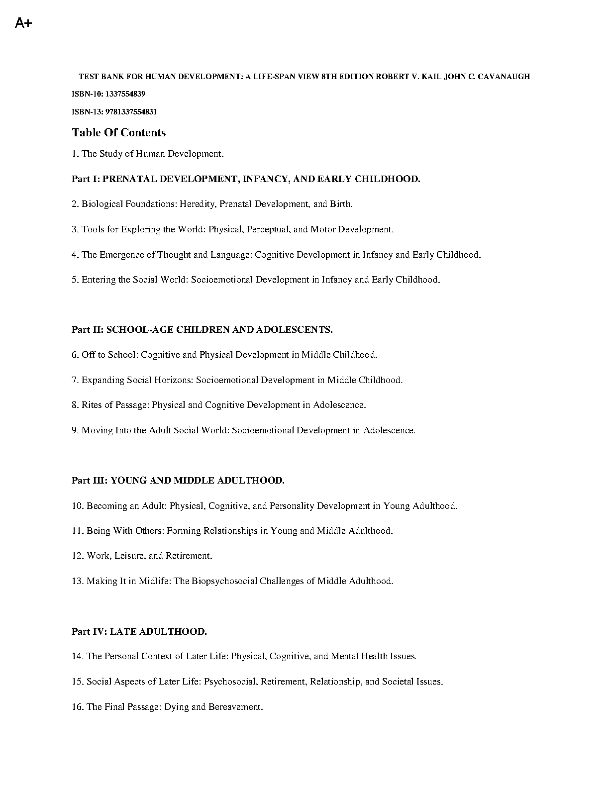 TEST BANK FOR HUMAN DEVELOPMENT: A LIFE-SPAN VIEW 8TH EDITION BY ROBERT V. KAIL JOHN C. CAVANAUGH