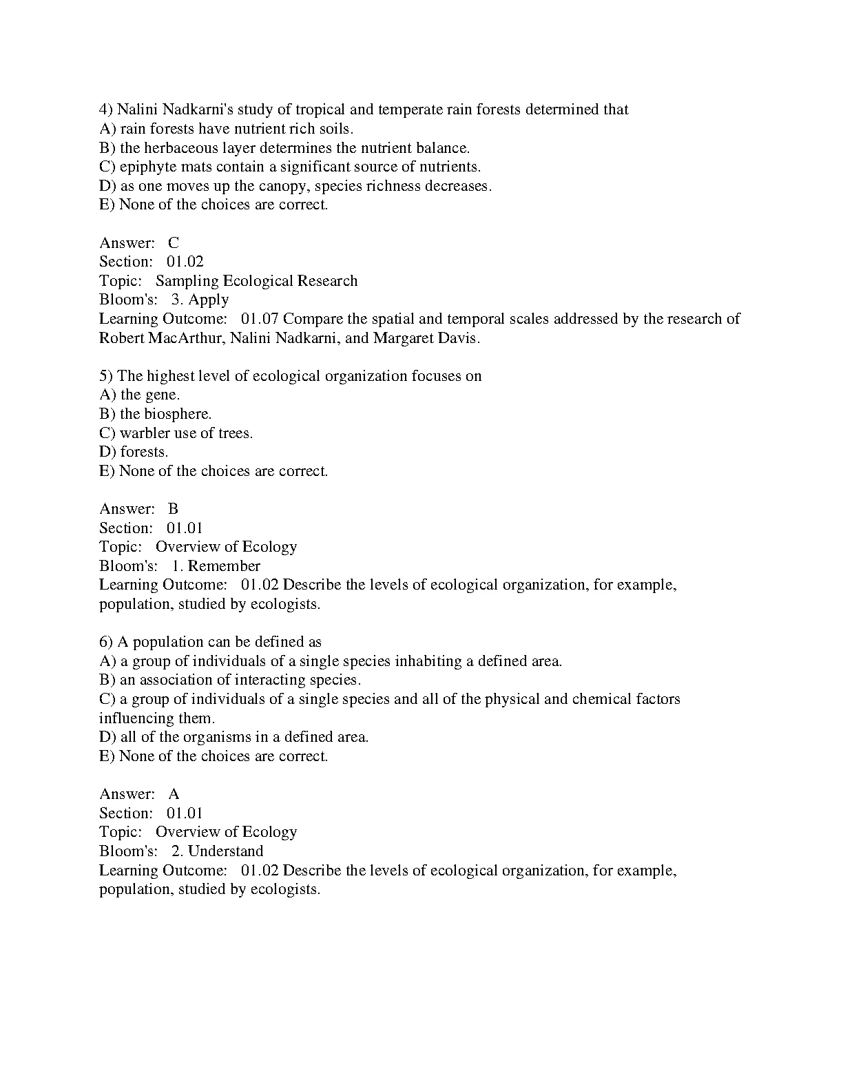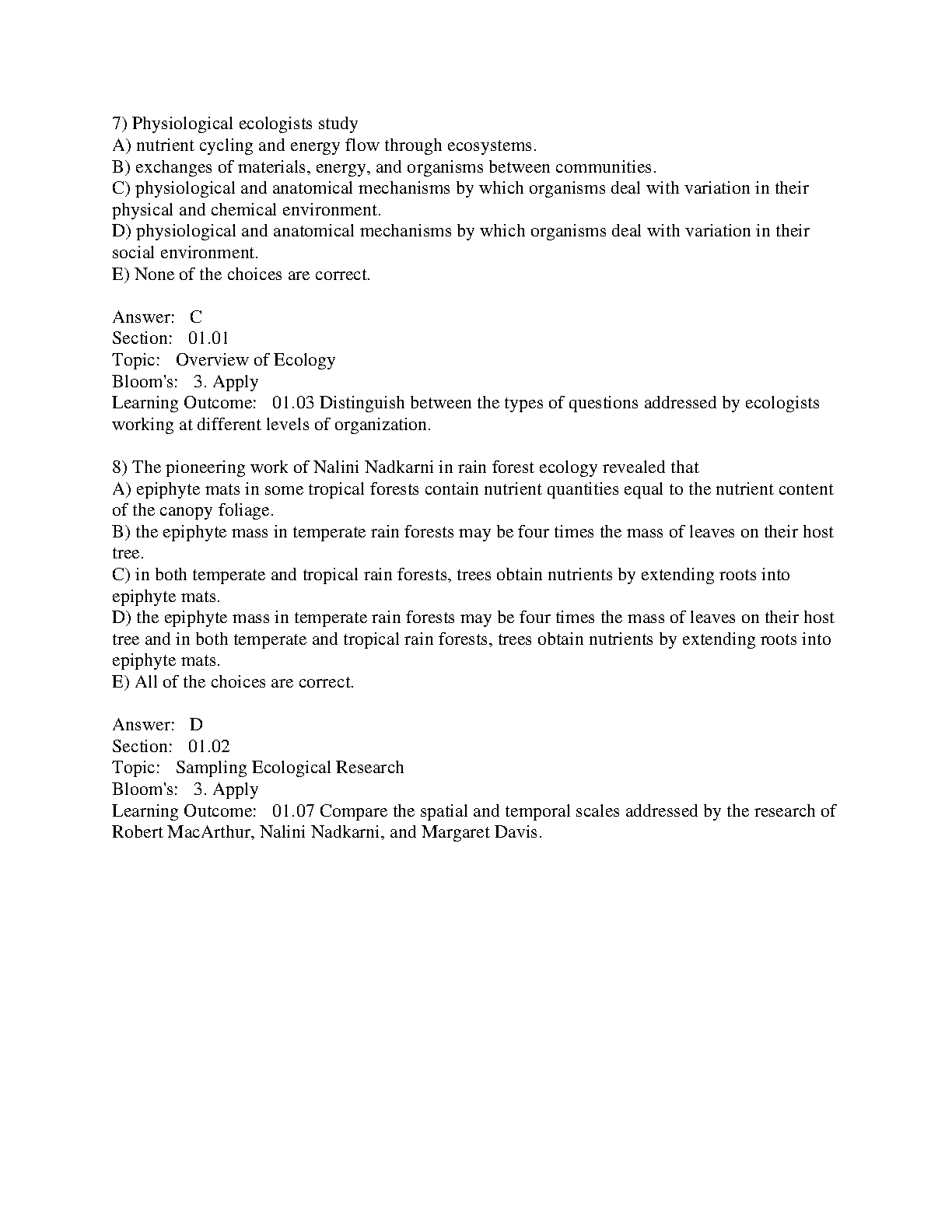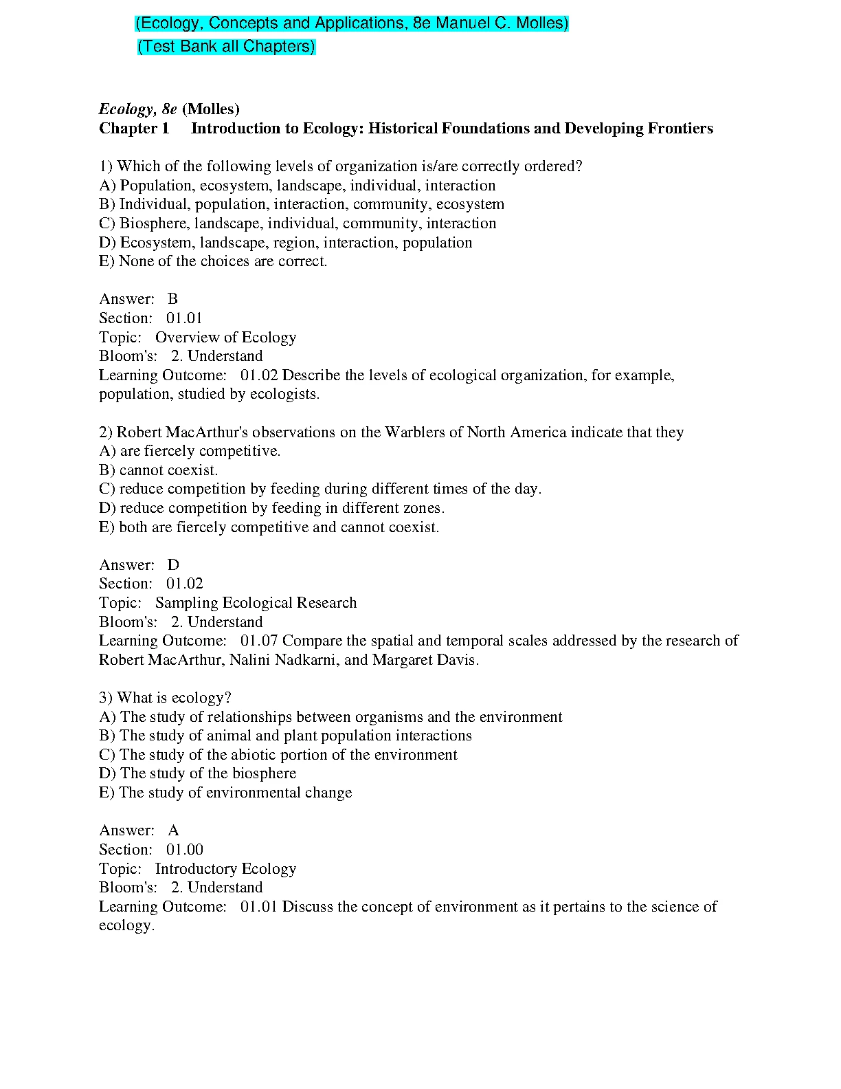 Test Bank For Introduction to Marine Biology 4th Edition by George Karleskint Chapter 1_20 INTRODUCTION TO MARINE BIOLOGY sparks curiosity about the marine world and provides an understanding of the p rocess of science. Taking an ecological approach and intended for non-science majors, the text provides succinct coverage of the content while the photos and art clearly illustrate key concepts. Studying is made easy with phonetic pronunciations, a running glossary of key terms, end-of-chapter questions, and suggestions for further reading at the end of each chapter. The open look and feel of INTRODUCTION TO MARINE BIOLOGY and the enhanced art program convey the beauty and awe of life in the ocean. Twenty spectacular photos open the chapters, piquing the motivation and attention of students, and over 60 photos and pieces of art are new or redesigned Contents Overview. Preface. PART I: THE OCEAN ENVIRONMENT. 1. Science and Marine Biology. 2. Fundamentals of Ecology. 3. Geology of the Ocean. 4. 4. Water, Waves, and Tides. PART II: MARINE ORGANISMS. 5. Biological Concepts. 6. Marine Microbes. 7. Multicellular Primary Producers. 8. Lower Invertebrates. 9. Higher Invertebrates. 10. Marine Fishes. 11. Marine Reptiles and Birds. 12. Marine Mammals. PART III: MARINE ECOSYSTEMS. 13. Intertidal Communities. 14. Estuaries. 15. Coral Reef Communities. 16. Continental Shelves and Neritic Zone. 17. The Open Sea. 18. Life in the Ocean's Depths. PART IV: HUMANS AND THE SEA. 19. Harvesting the Ocean's Resources. 20. Oceans in Jeopardy. Test Bank For Introduction to Marine Biology 4th Edition by George Karleskint Chapter 1_20 INTRODUCTION TO MARINE BIOLOGY sparks curiosity about the marine world and provides an understanding of the p rocess of science. Taking an ecological approach and intended for non-science majors, the text provides succinct coverage of the content while the photos and art clearly illustrate key concepts. Studying is made easy with phonetic pronunciations, a running glossary of key terms, end-of-chapter questions, and suggestions for further reading at the end of each chapter. The open look and feel of INTRODUCTION TO MARINE BIOLOGY and the enhanced art program convey the beauty and awe of life in the ocean. Twenty spectacular photos open the chapters, piquing the motivation and attention of students, and over 60 photos and pieces of art are new or redesigned Contents Overview. Preface. PART I: THE OCEAN ENVIRONMENT. 1. Science and Marine Biology. 2. Fundamentals of Ecology. 3. Geology of the Ocean. 4. 4. Water, Waves, and Tides. PART II: MARINE ORGANISMS. 5. Biological Concepts. 6. Marine Microbes. 7. Multicellular Primary Producers. 8. Lower Invertebrates. 9. Higher Invertebrates. 10. Marine Fishes. 11. Marine Reptiles and Birds. 12. Marine Mammals. PART III: MARINE ECOSYSTEMS. 13. Intertidal Communities. 14. Estuaries. 15. Coral Reef Communities. 16. Continental Shelves and Neritic Zone. 17. The Open Sea. 18. Life in the Ocean's Depths. PART IV: HUMANS AND THE SEA. 19. Harvesting the Ocean's Resources. 20. Oceans in Jeopardy TEST BANK FOR Ecology, Concepts and Applications, 8TH EDITION BY Manuel C. Molles