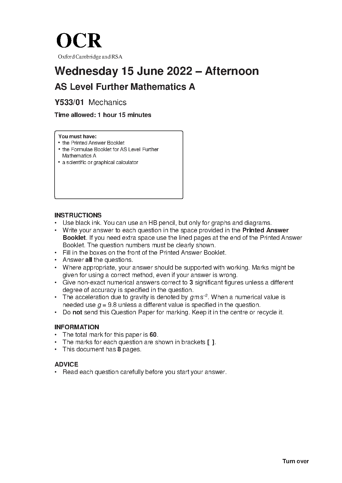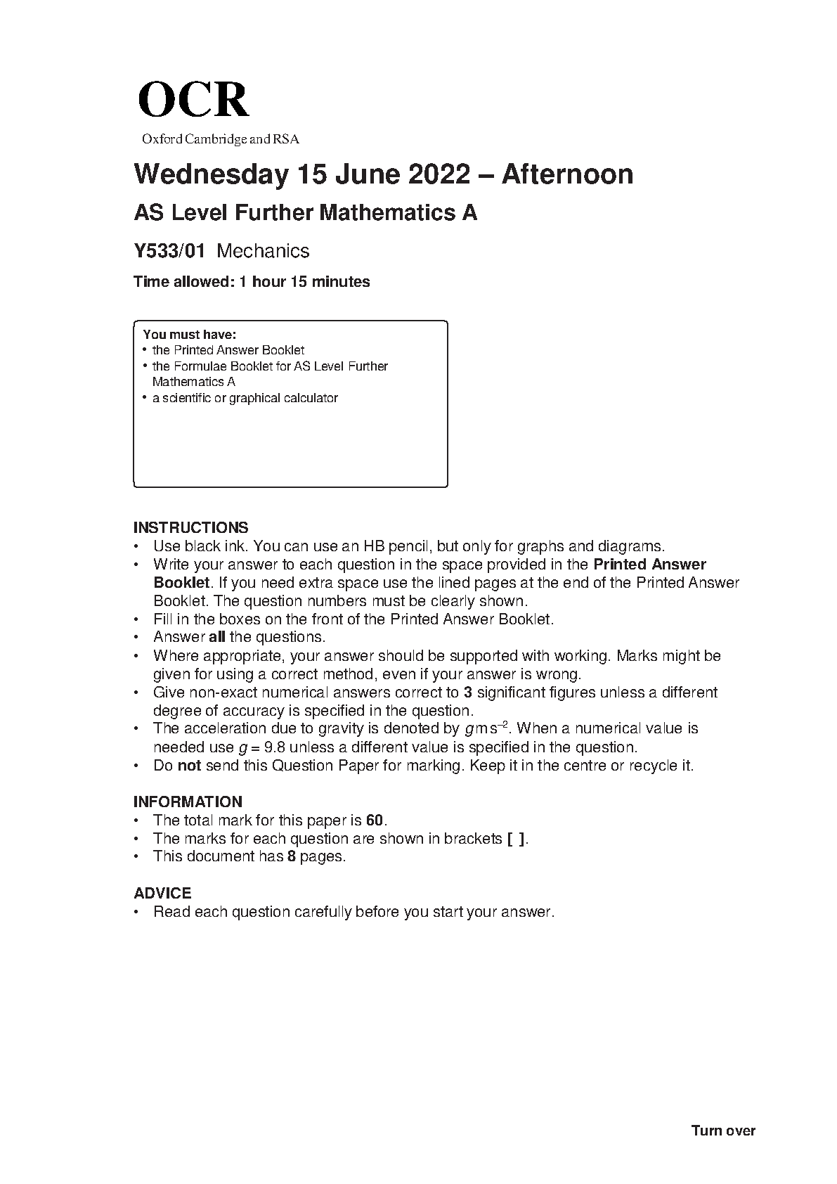OCR AS FURTHER MATHEMATICS A PAPER 1 JUNE 2022 QUESTION PAPER (Y533/01: Mechanics)