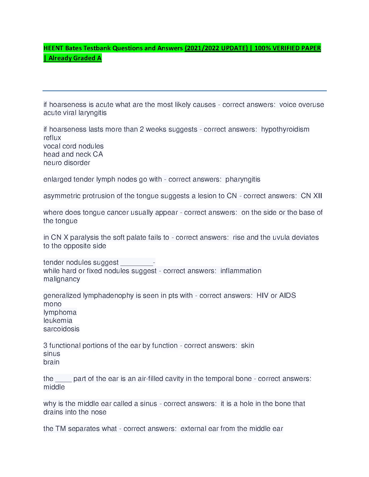 Test Bank For HEENT Bates Questions and Answers 2023/2024