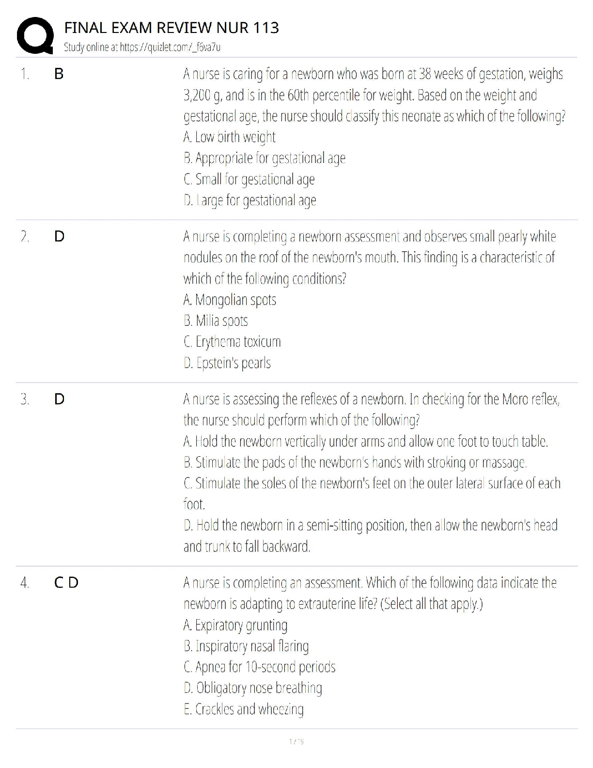 Ace your NUR 113 final exam with this comprehensive review guide. Designed to help students pass on their first attempt and avoid resits, this resource covers essential newborn care topics, assessment techniques, and common conditions. Prepare for success in your nursing studies and clinical practice with expertly crafted content.