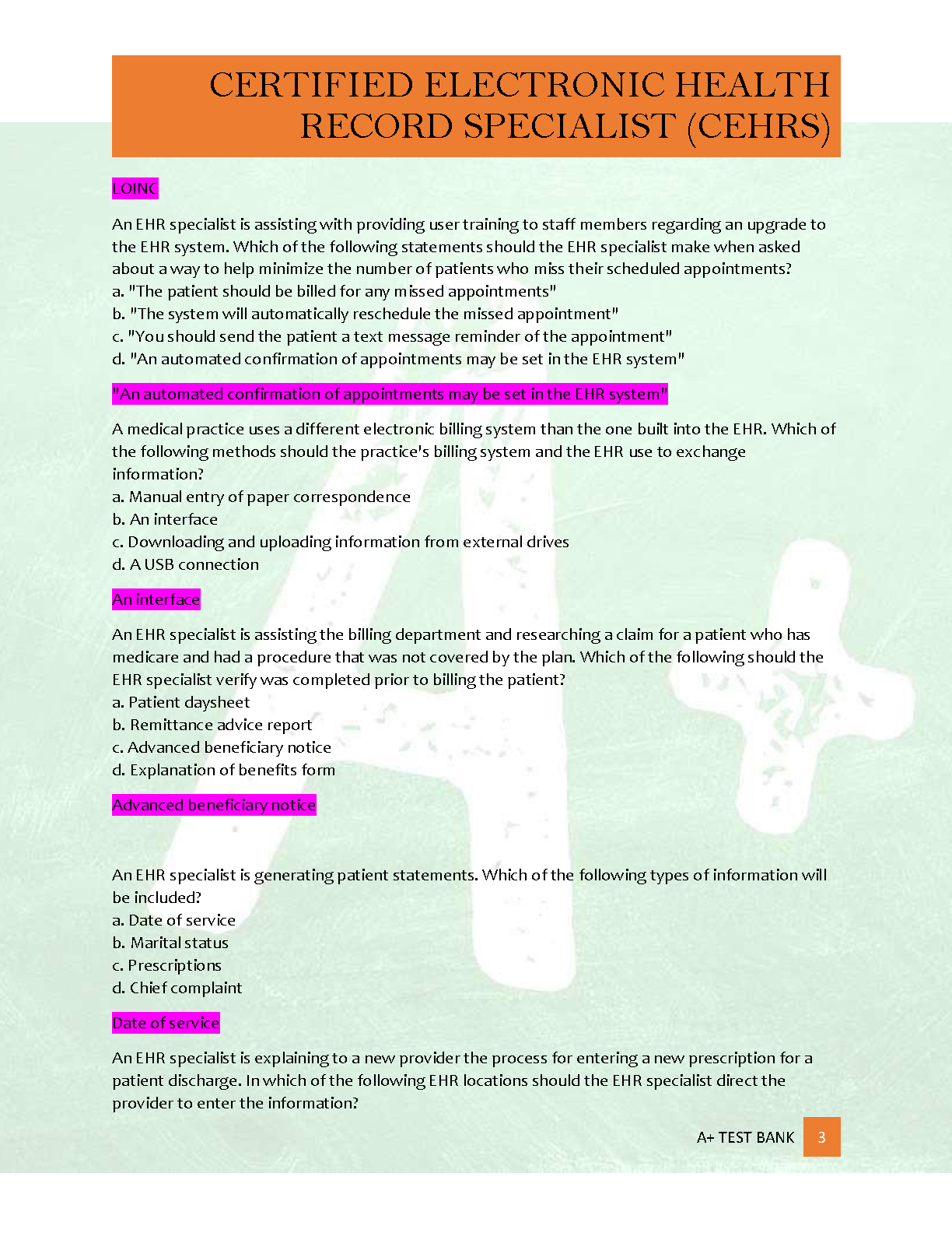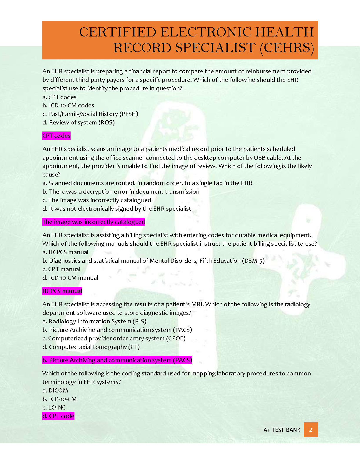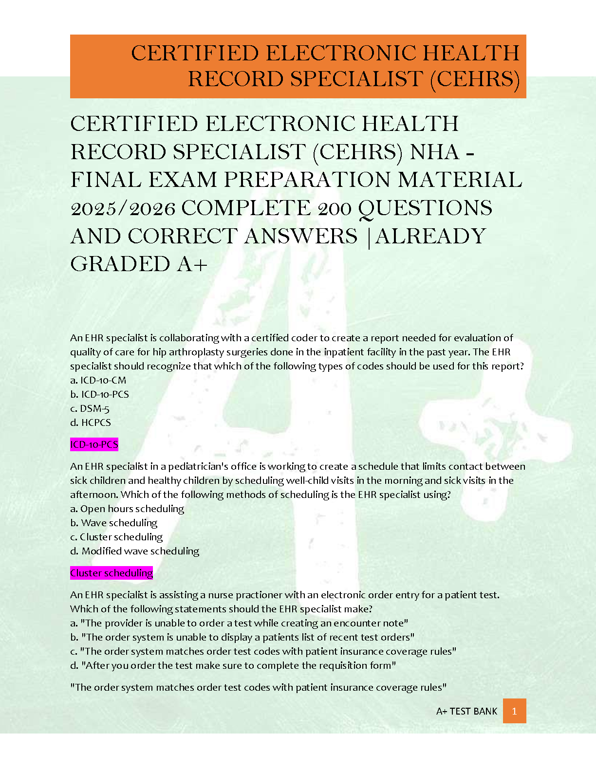 Prepare effectively for the NHA Certified Electronic Health Record Specialist (CEHRS) exam with this comprehensive 2025/2026 test bank. Featuring 200 meticulously developed questions complete with accurate, expert-graded answers, this resource is engineered to help you master essential CEHRS competencies. Gain confidence in critical areas such as ICD-10-CM, ICD-10-PCS, DSM-5, HCPCS coding, patient scheduling, and electronic order management. This exam preparation material is your ultimate tool to understand complex topics, simulate exam conditions, and ensure you pass your certification on the first try with an A+ grade, thereby avoiding expensive resits. Ideal for aspiring EHR specialists aiming for career success.
