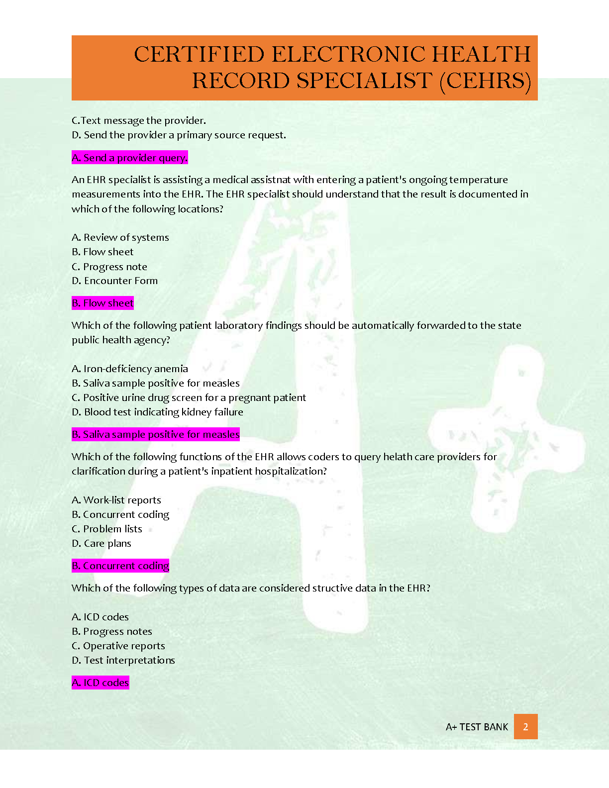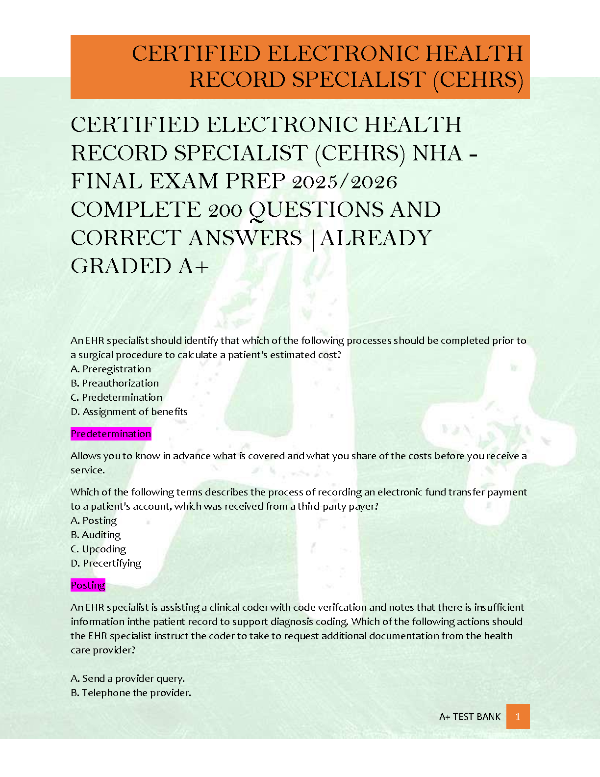 Prepare for unparalleled success with this expertly curated 2025/2026 Test Bank for the NHA Certified Electronic Health Record Specialist (CEHRS) Final Exam. This invaluable resource features over 200 meticulously crafted questions, each accompanied by verified, A+ graded answers, ensuring you grasp every critical concept. Designed to build your confidence and knowledge, this test bank is your ultimate tool for passing your CEHRS certification exam on your very first attempt, effectively avoiding the need for costly resits and accelerating your career in healthcare.