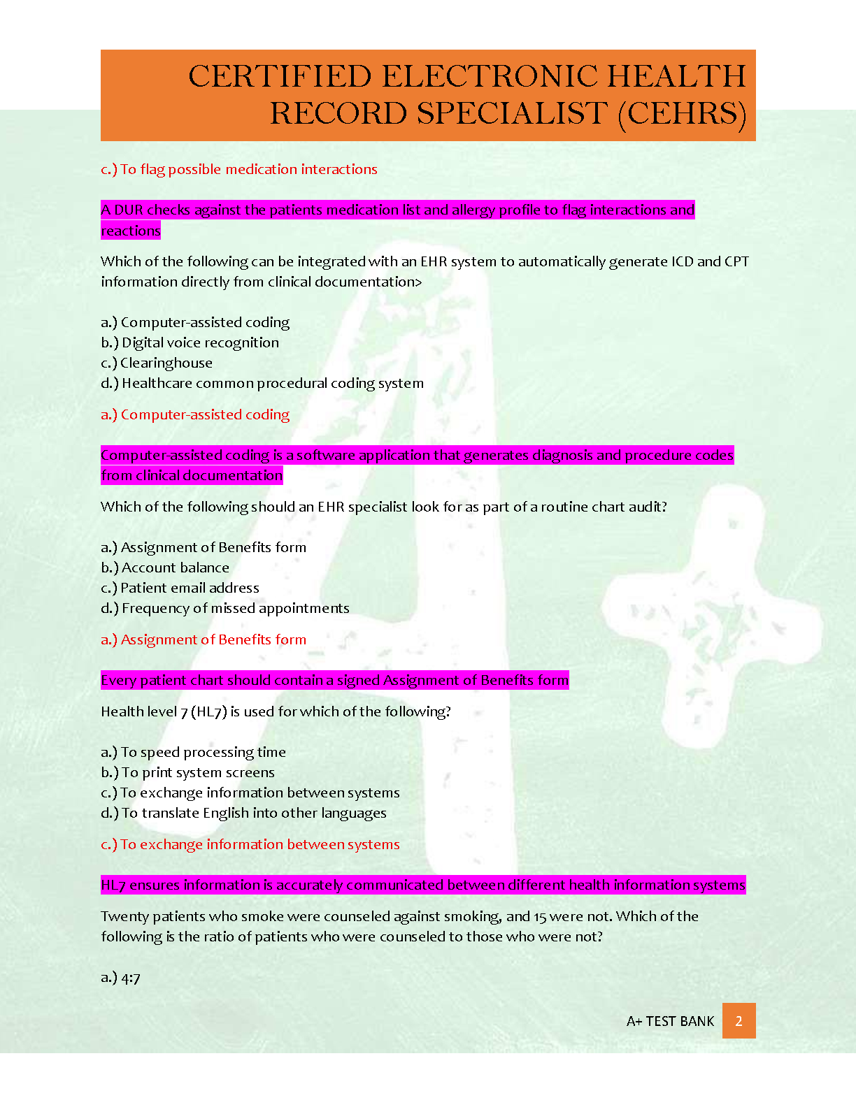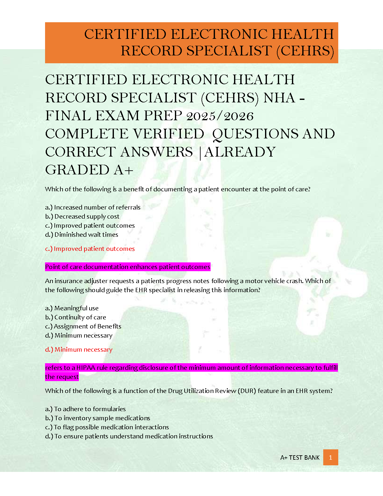 Master the Certified Electronic Health Record Specialist (CEHRS) NHA certification exam with this comprehensive study guide. Featuring verified questions and correct answers, this resource is designed to help students achieve an A+ grade and pass their exam on the first attempt, avoiding resits. Prepare effectively for the 2025/2026 academic year.