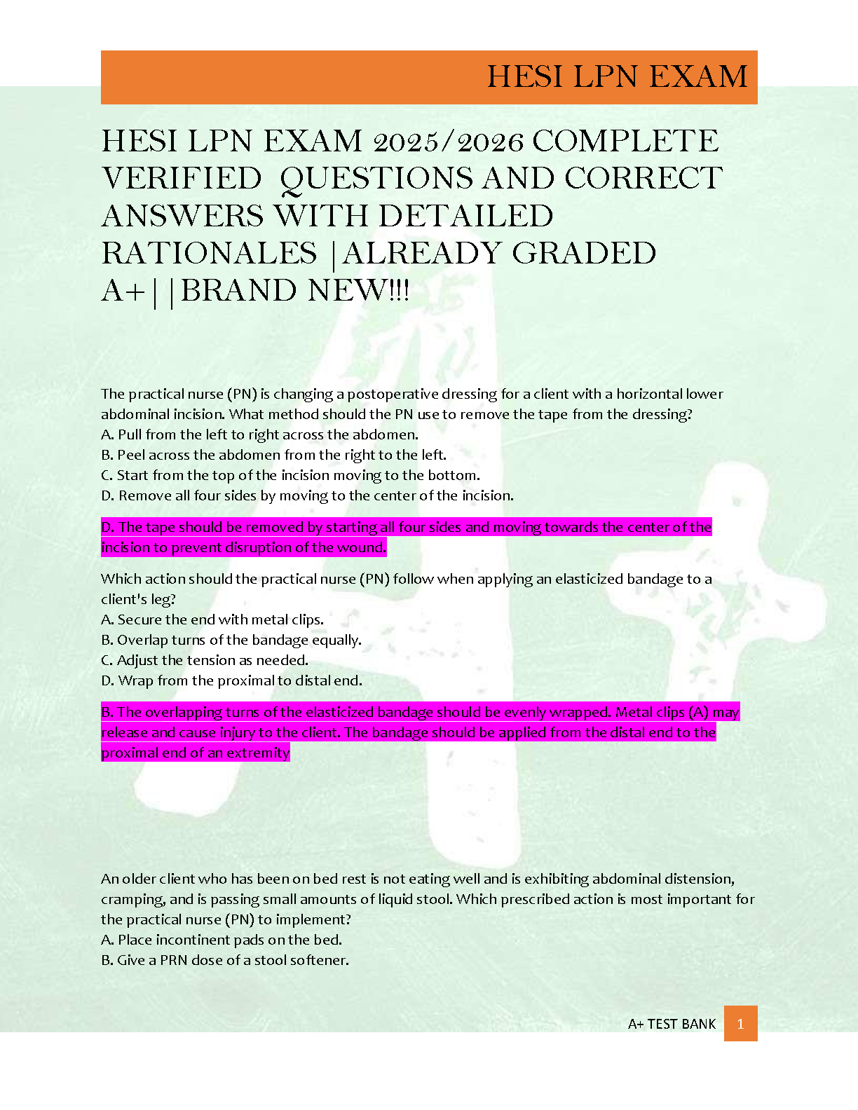 Ace the HESI LPN exam with this comprehensive study guide for the 2025/2026 academic year. This resource features verified questions and correct answers, accompanied by detailed rationales, to ensure you understand the material thoroughly. Designed to help students pass their exams on the first attempt and avoid resits. Includes practice scenarios and explanations for key nursing concepts.