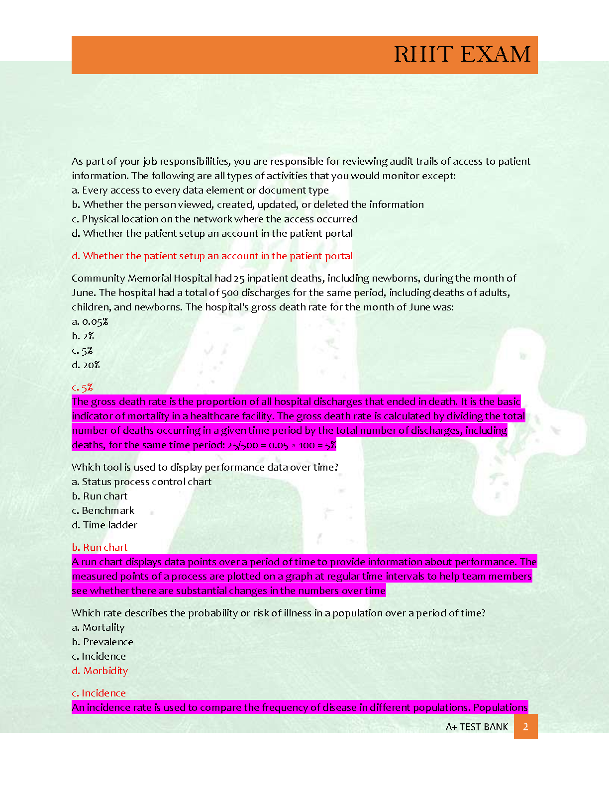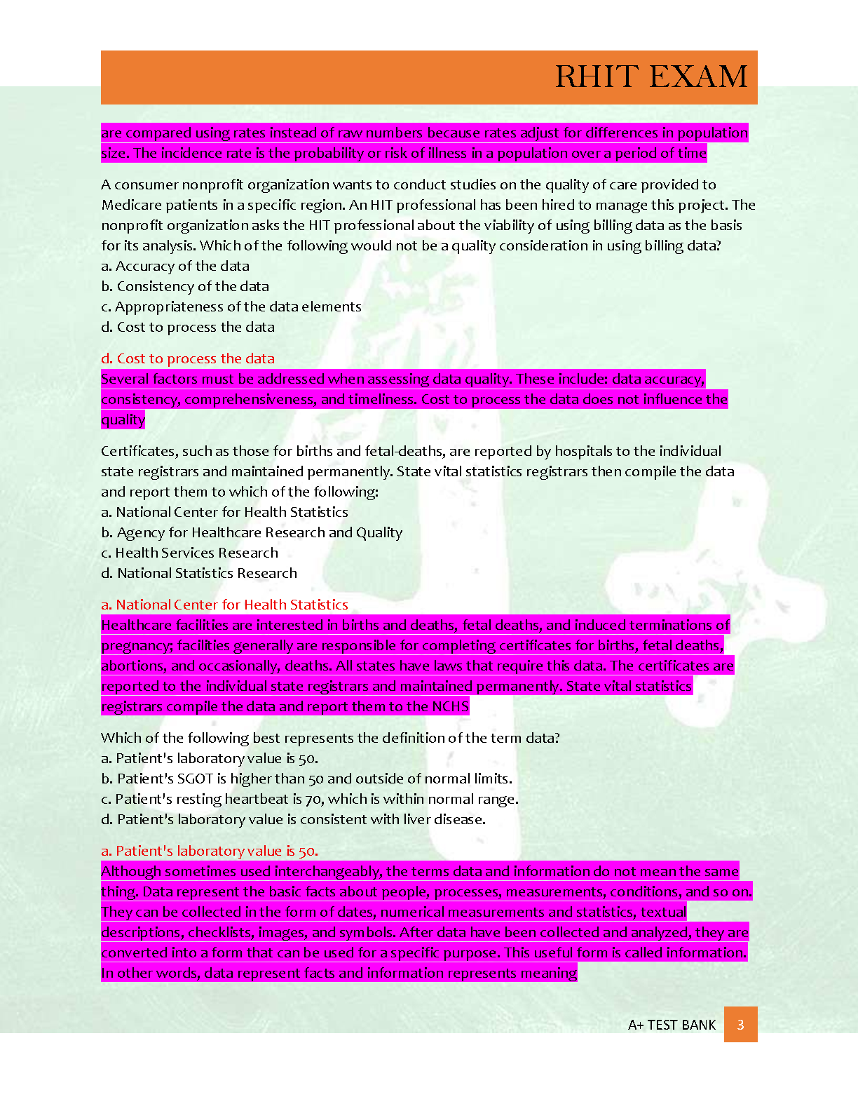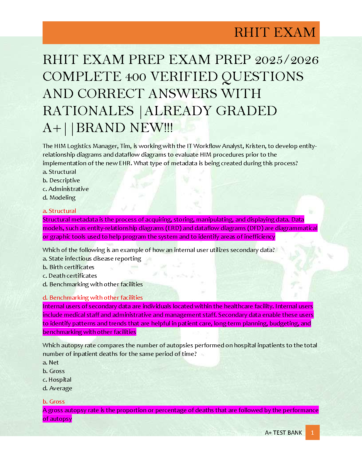 This brand-new, A+ graded RHIT Exam Preparation Test Bank for the 2025/2026 academic year offers over 400 thoroughly verified questions with complete correct answers and detailed rationales. Designed to mirror the actual Registered Health Information Technician (RHIT) exam, this comprehensive resource is perfect for students aiming to master key concepts, identify areas for improvement, and significantly boost their scores. Utilize these practice questions to confidently pass your RHIT certification exam on the first attempt and avoid costly resits, ensuring a strong foundation in Health Information Management.