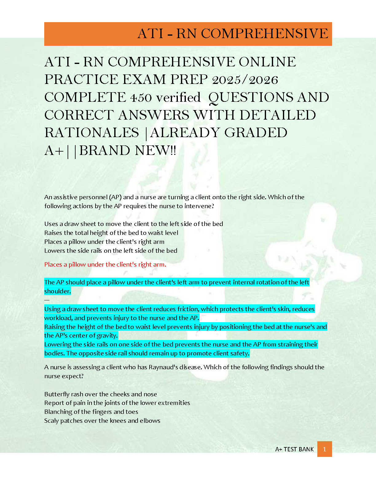 Unlock your potential for first-attempt success on the ATI RN Comprehensive Exam with this brand new 2025/2026 edition test bank. Featuring 450 meticulously verified questions and comprehensive, A+ graded correct answers with detailed rationales, this resource is designed by ATI Nursing Education experts to equip you with the knowledge and confidence to excel. Avoid resits and solidify your understanding of critical nursing concepts to pass your exams on the first try.