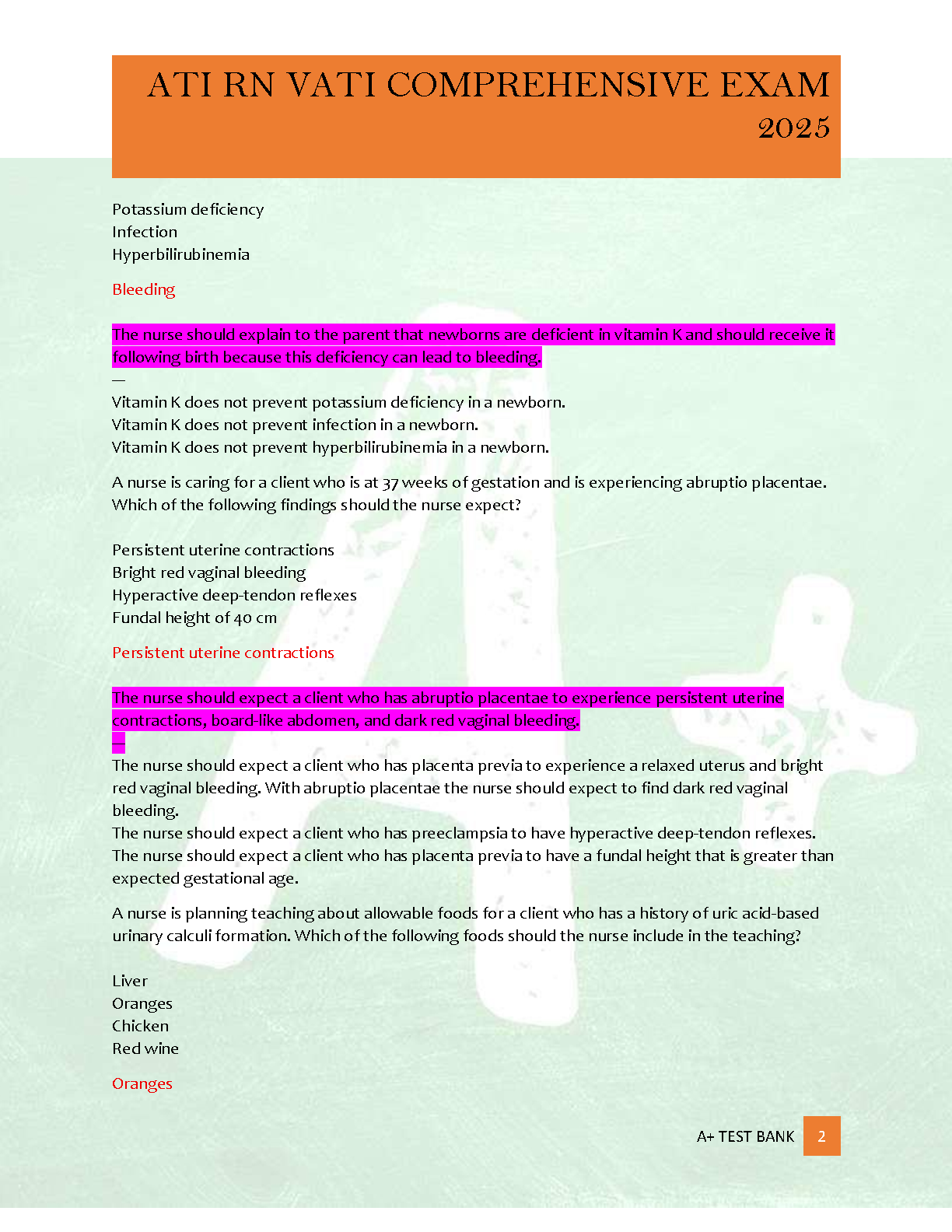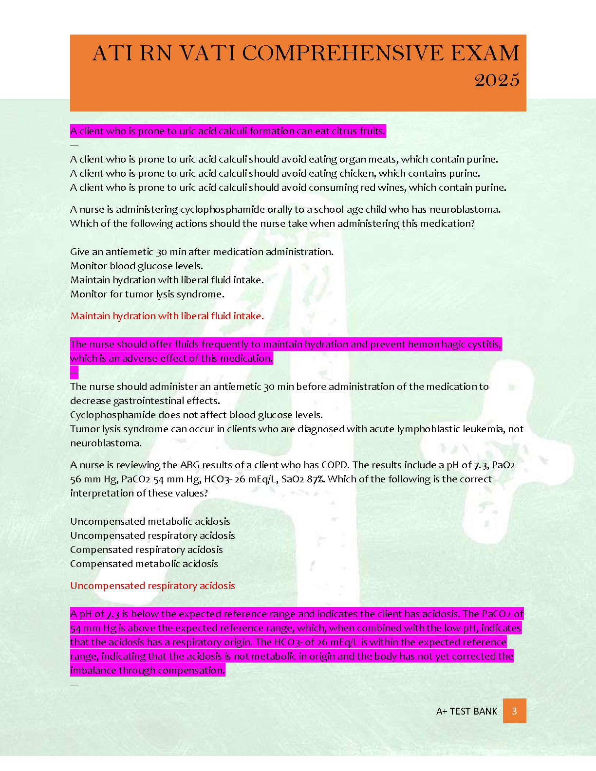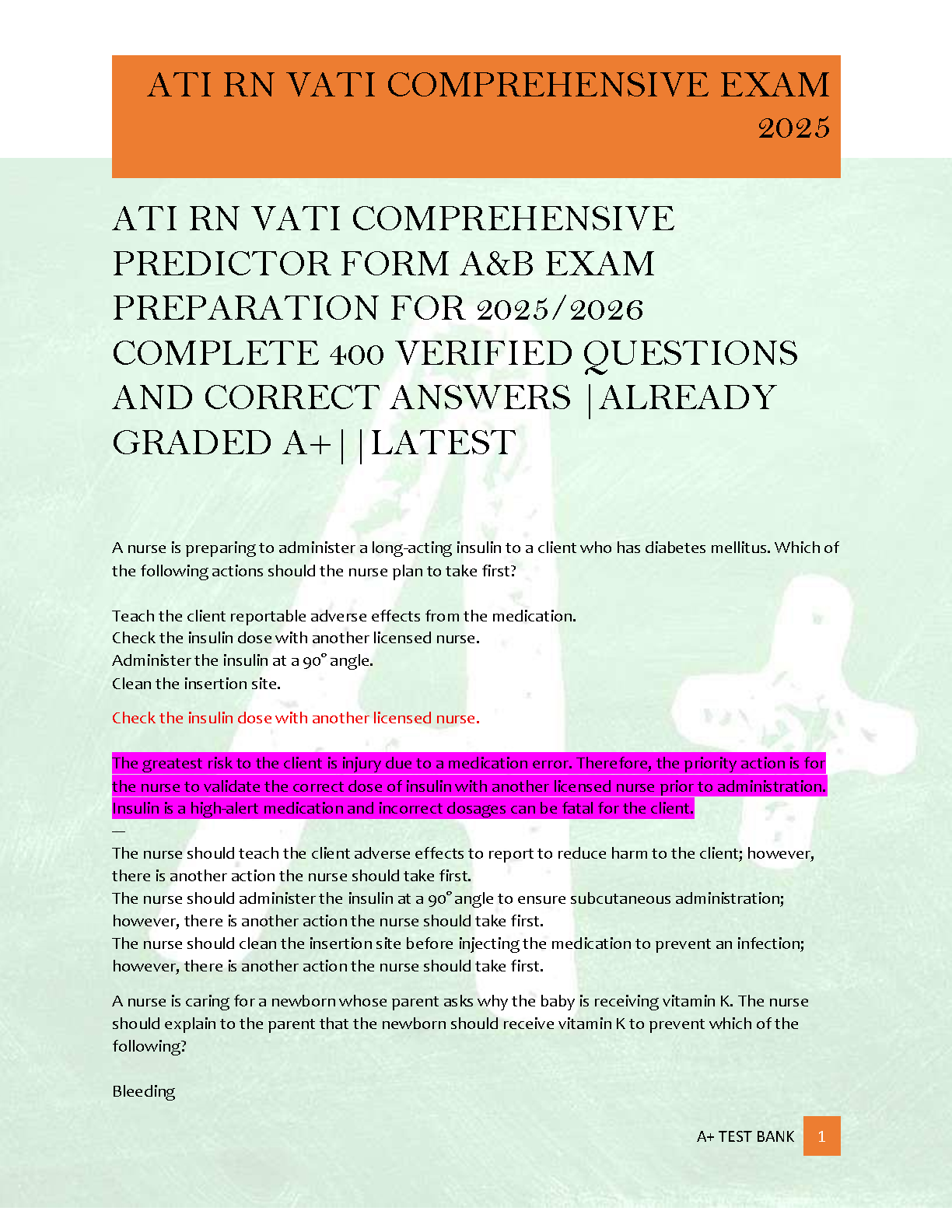 Master the ATI RN VATI Comprehensive Predictor Form A&B with this essential study guide. Featuring 400 verified questions and correct answers, this resource is designed to help nursing students excel on their exams and avoid resits. Prepare thoroughly for the 2025/2026 academic year and achieve a graded A+ on your first attempt.