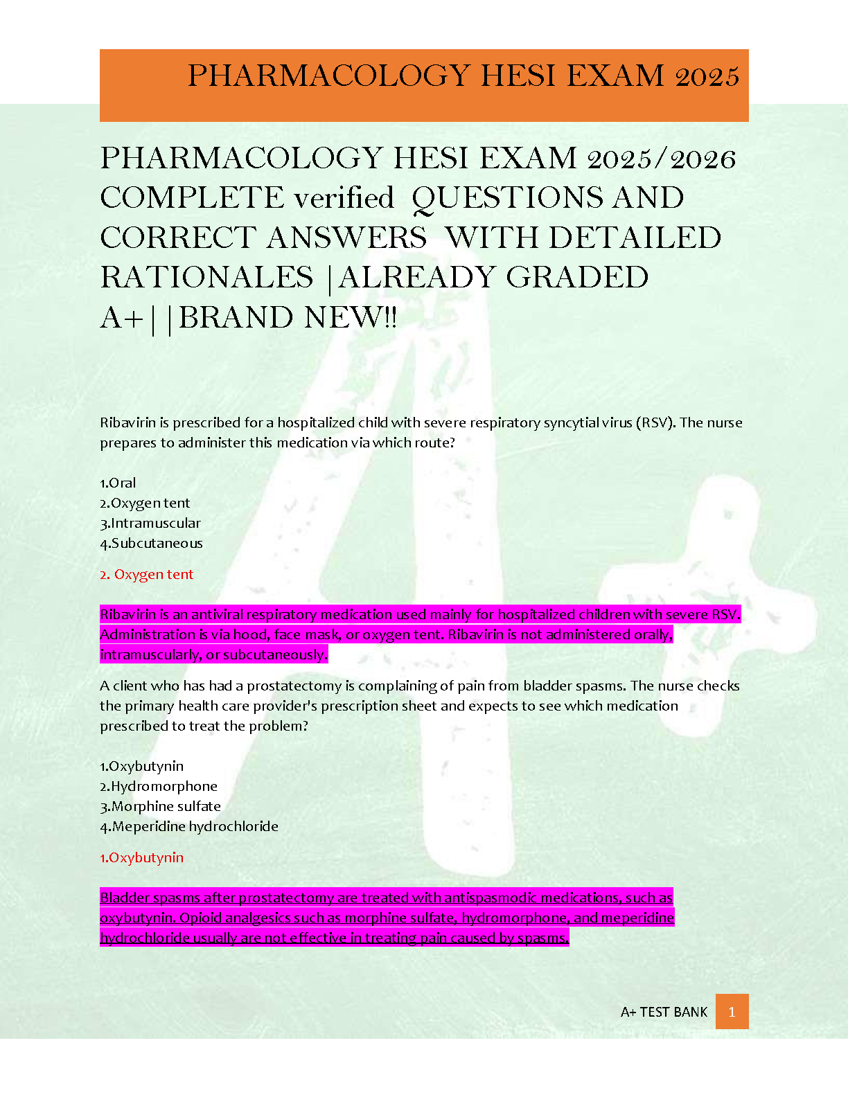 Master your HESI Pharmacology exam with this comprehensive 2025/2026 edition. Featuring verified questions and detailed rationales, this resource is designed to help students achieve A+ grades and avoid resits. Prepare effectively for your first attempt with expert-crafted study materials.