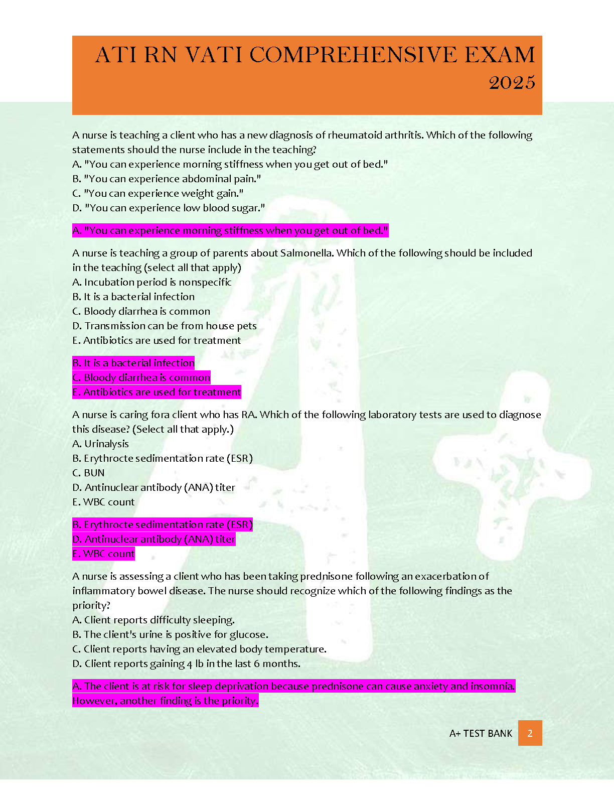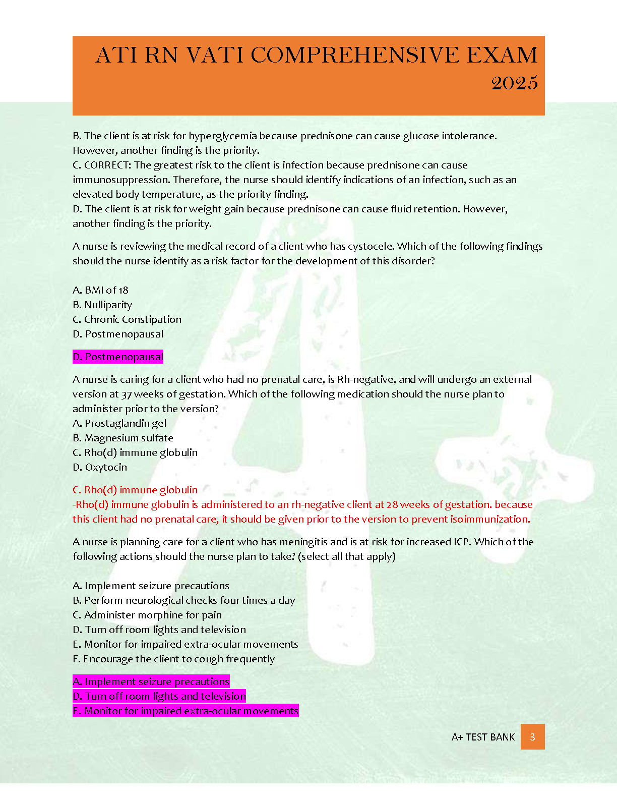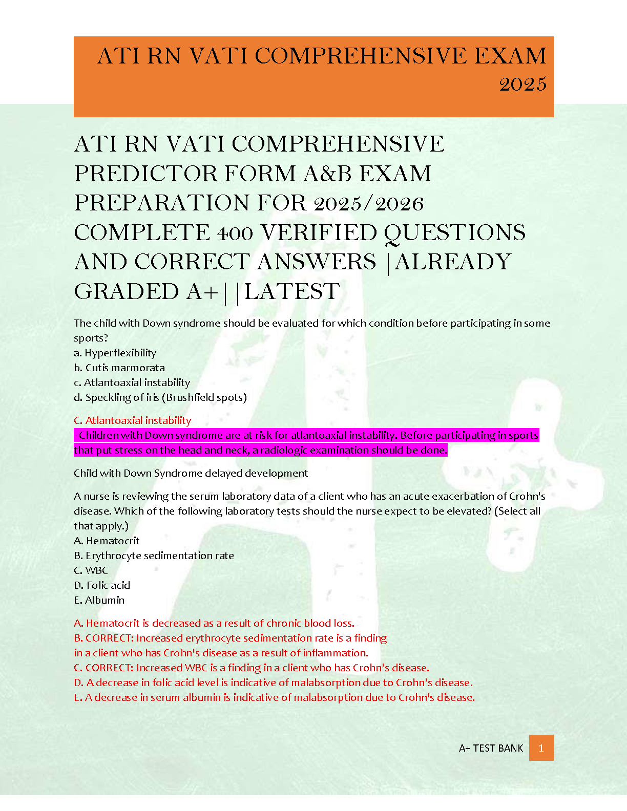 Ace your ATI RN Vati Comprehensive Predictor Form A&B exam with this essential study guide for the 2025/2026 academic year. Featuring 400 verified and meticulously graded questions and answers, this resource is designed to equip nursing students with the knowledge and practice needed to pass their exams on the first attempt and avoid resits. Master complex concepts and build confidence for exam success.