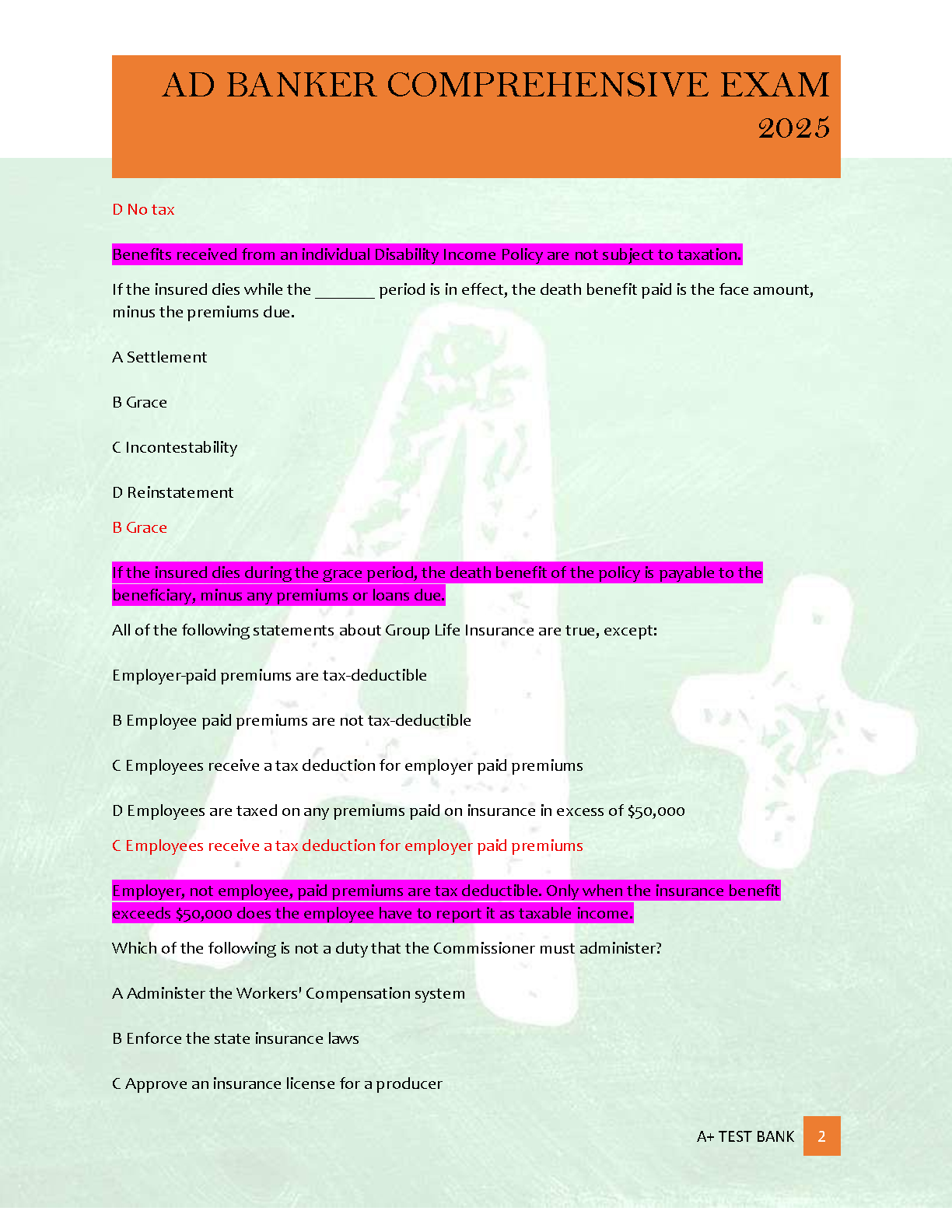 Master the AD Banker Comprehensive Exam with this essential resource for the 2025/2026 academic year. Featuring fully verified questions and correct answers, graded A+, this guide is designed to ensure your first-time pass and avoid resits. Dive into practice questions covering life insurance options and taxation to solidify your understanding and boost your confidence for exam day.