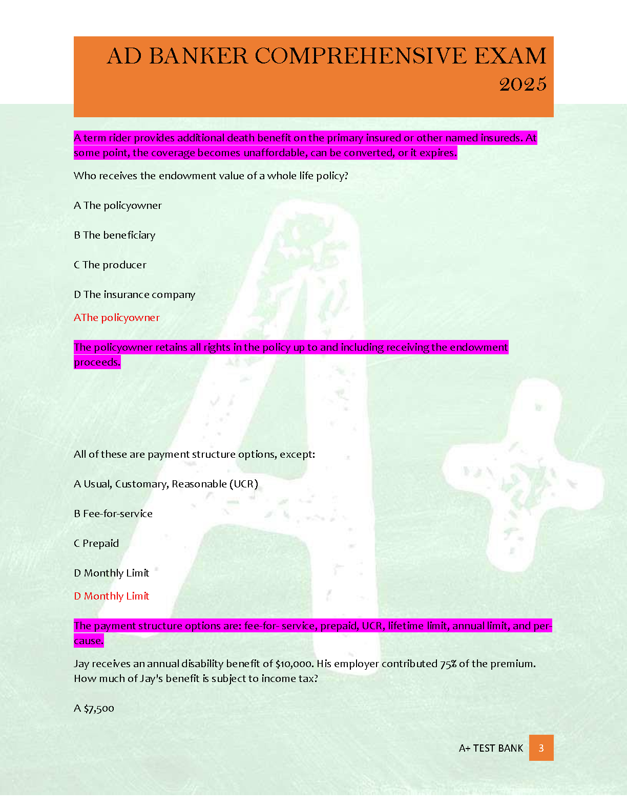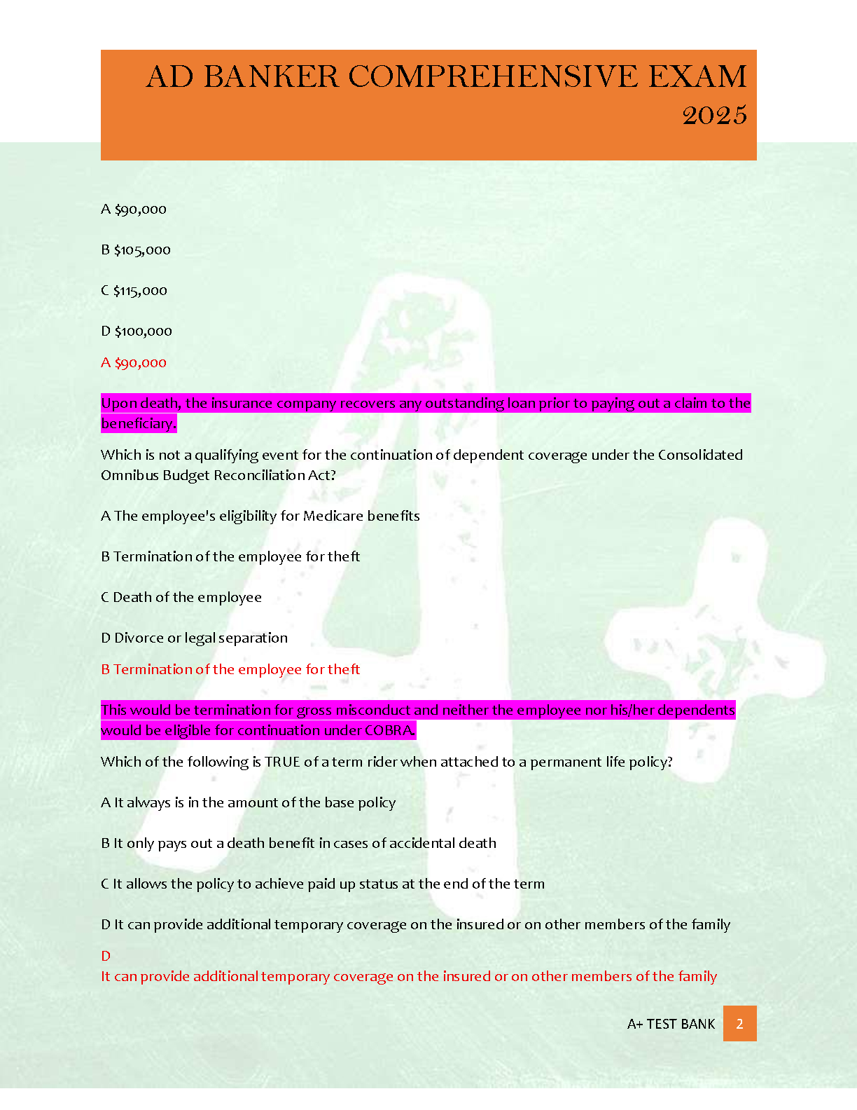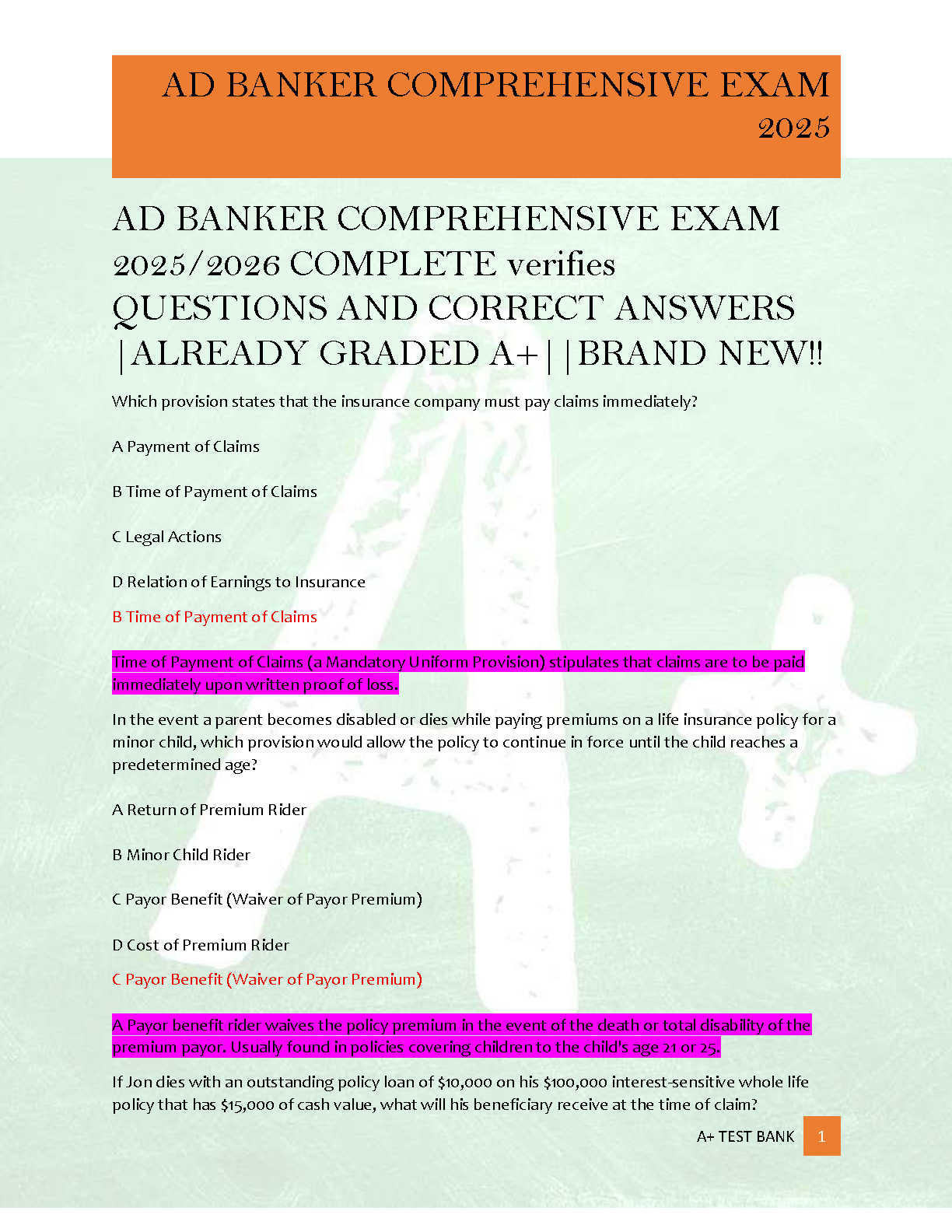Unlock your potential with this brand-new, A+ graded test bank for the AD Banker Comprehensive Exam 2025/2026. Meticulously compiled and verified, this resource offers a complete set of up-to-date questions and thoroughly explained correct answers. Designed specifically to help students pass their AD Banker licensing exam on the very first attempt, this test bank ensures you avoid costly resits and confidently achieve your certification. Prepare effectively with this indispensable study tool, crafted for maximum understanding and exam readiness.