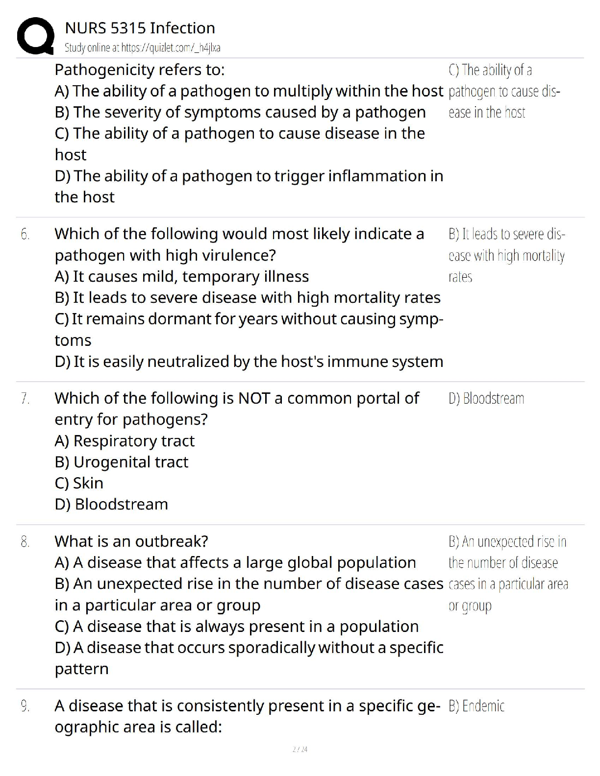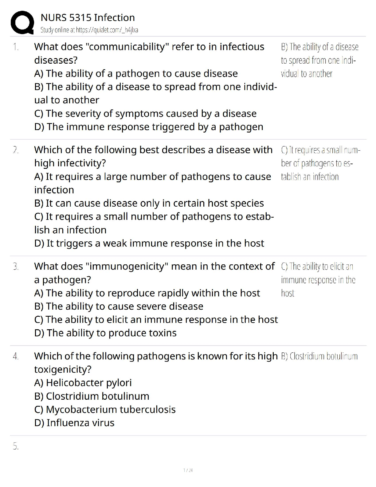 Prepare comprehensively for your NURS 5315 Infection course exams with this robust test bank for the 2025/2026 academic year. This essential study resource provides a curated collection of multiple-choice questions covering critical advanced concepts in infectious diseases, including pathogenesis, epidemiology, communicability, infectivity, immunogenicity, and toxigenicity. Designed to mirror typical exam formats, these practice questions will solidify your understanding of key principles and help you identify areas for further study. Utilize this powerful tool to boost your confidence, enhance your knowledge retention, and ensure you pass your nursing exams on the very first attempt, avoiding costly resits. Ideal for graduate nursing students seeking to master infection control and prevention.