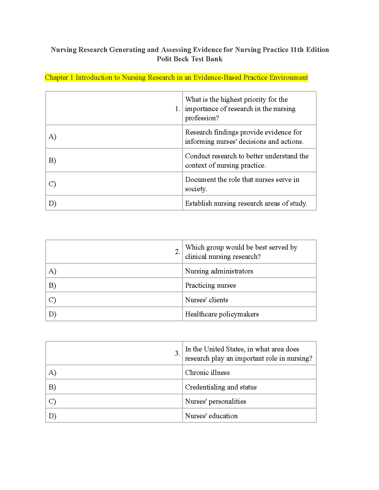Nursing Research: Generating and Assessing Evidence for Nursing Practice, 11th Edition Test Bank by Denise F. Polit and Cheryl Tatano Beck