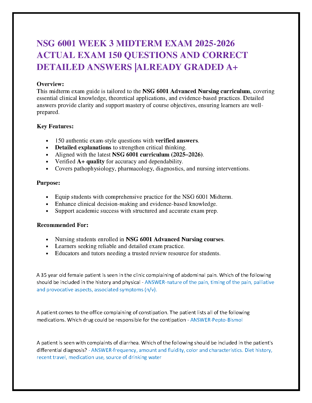 Master your NSG 6001 Advanced Nursing Week 3 Midterm Exam 2025-2026 with this comprehensive test bank. Packed with 150 authentic, exam-style questions and meticulously verified, detailed A+ answers, this resource is your ultimate study partner. Fully aligned with the latest NSG 6001 curriculum for the 2025-2026 academic year, it provides in-depth explanations to boost critical thinking across pathophysiology, pharmacology, diagnostics, and nursing interventions. Designed to ensure you pass your exams on the first attempt and confidently avoid resits, this guide offers unparalleled practice and reinforces mastery of crucial advanced nursing concepts.