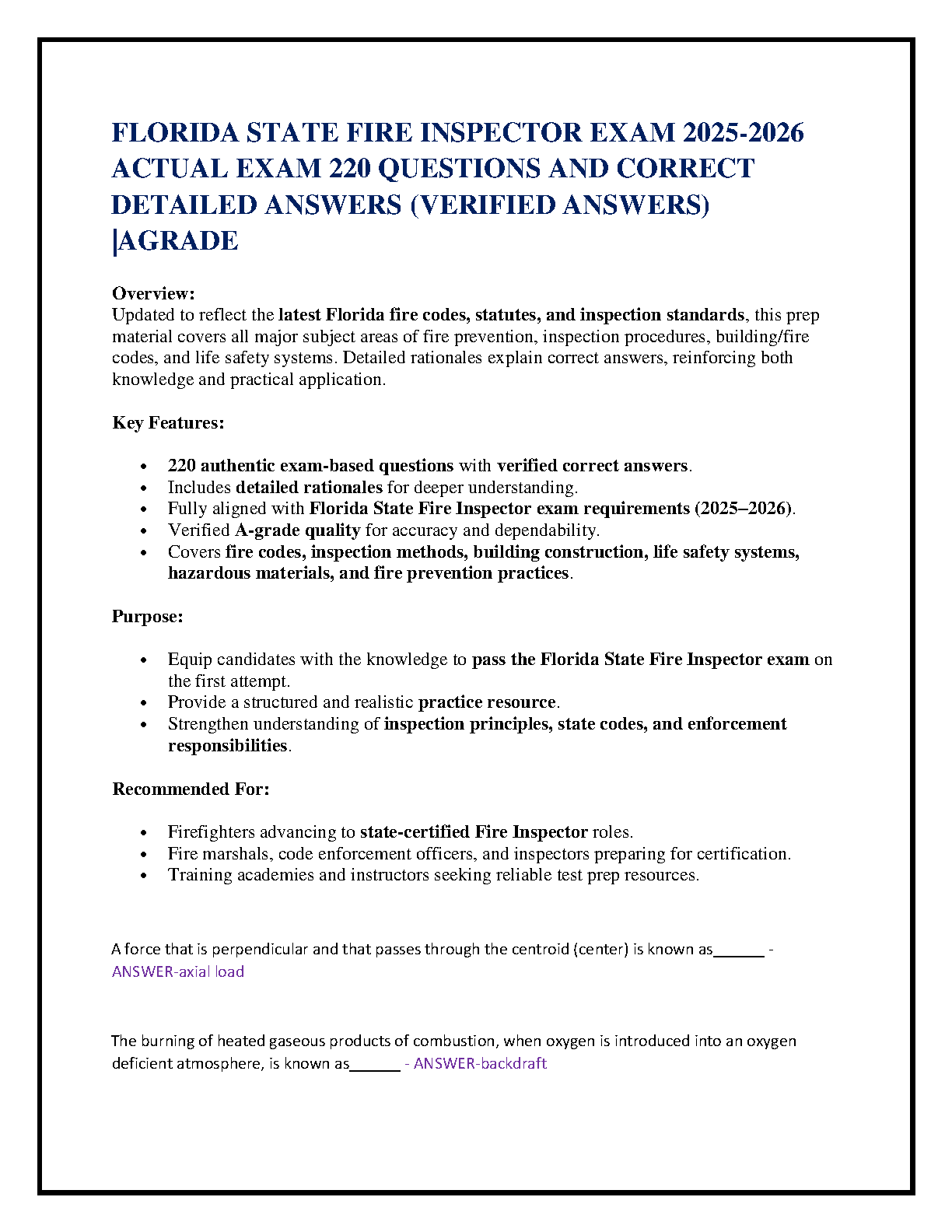 Ace your Florida State Fire Inspector Certification Exam 2025-2026 with this premium, A-grade verified test bank. This comprehensive resource features 220 authentic, exam-based questions complete with detailed rationales for a deeper understanding. Meticulously updated to align with the latest Florida fire codes, statutes, and inspection standards, it covers all critical subject areas including fire prevention, inspection procedures, building and fire codes, life safety systems, hazardous materials, and enforcement responsibilities. Designed to provide realistic practice and strengthen your knowledge, this material is your essential guide to confidently passing the Florida Fire Inspector exam on your very first attempt, thus avoiding costly resits.
