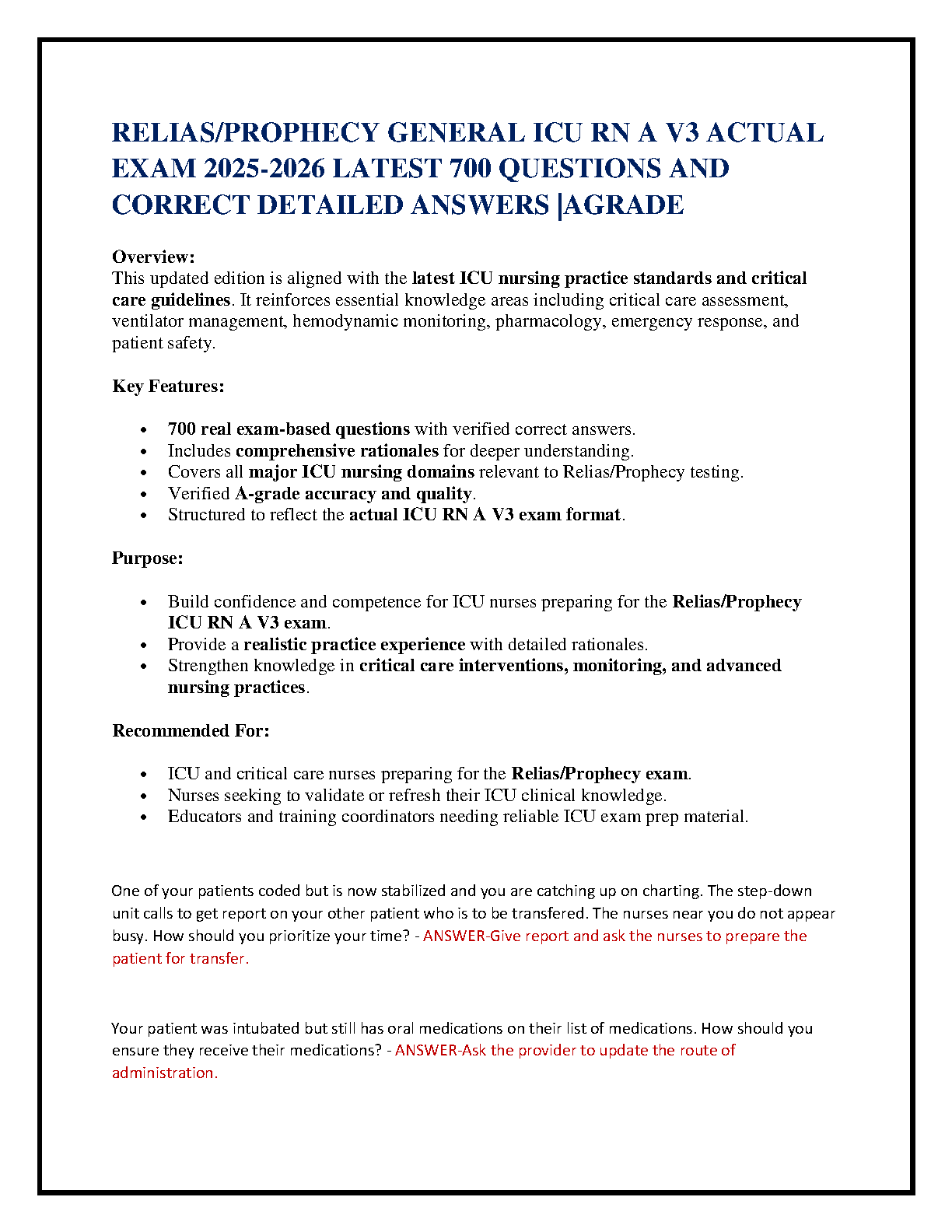 Elevate your critical care nursing knowledge and conquer the RELIAS/PROPHECY General ICU RN A V3 Exam (2025-2026 Latest Edition) with this comprehensive study resource. Engineered to help you achieve an A-grade and pass on your first attempt, this guide offers over 700 real exam-based questions, each accompanied by detailed, insightful rationales for deep understanding. The content is rigorously aligned with the latest ICU nursing practice standards and critical care guidelines, covering all essential domains including advanced assessment, ventilator management, hemodynamic monitoring, pharmacology, emergency response, and patient safety. Structured to precisely mirror the actual exam format, this material is indispensable for ICU and critical care nurses, those seeking to refresh their clinical knowledge, and educators needing reliable exam preparation tools, ensuring you avoid resits.
